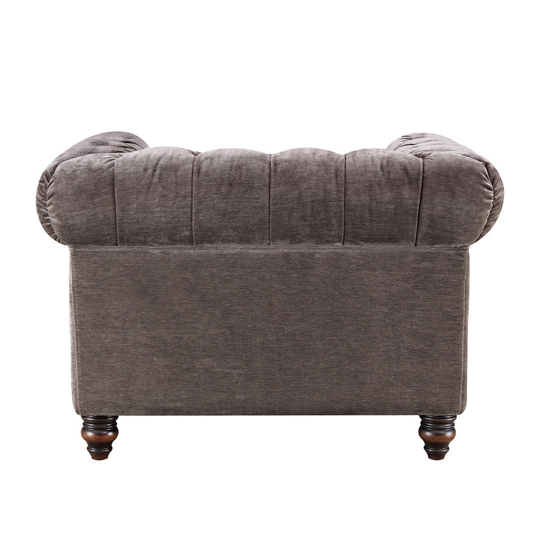 The feather down seating lets you sink into the seat for unmatched comfort. The premium seat cushions are removable and rest on a no-sag platform which provides balanced weight distribution for maximum durability and lasting comfort. This classic chesterfield is finished with hand-applied studding in Antique Brass with hardwood feet in walnut brown.
