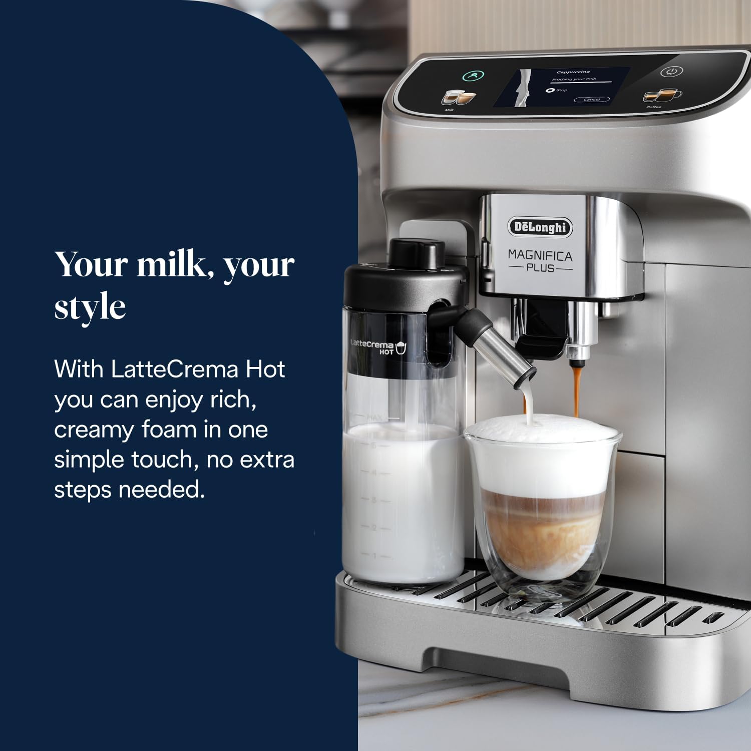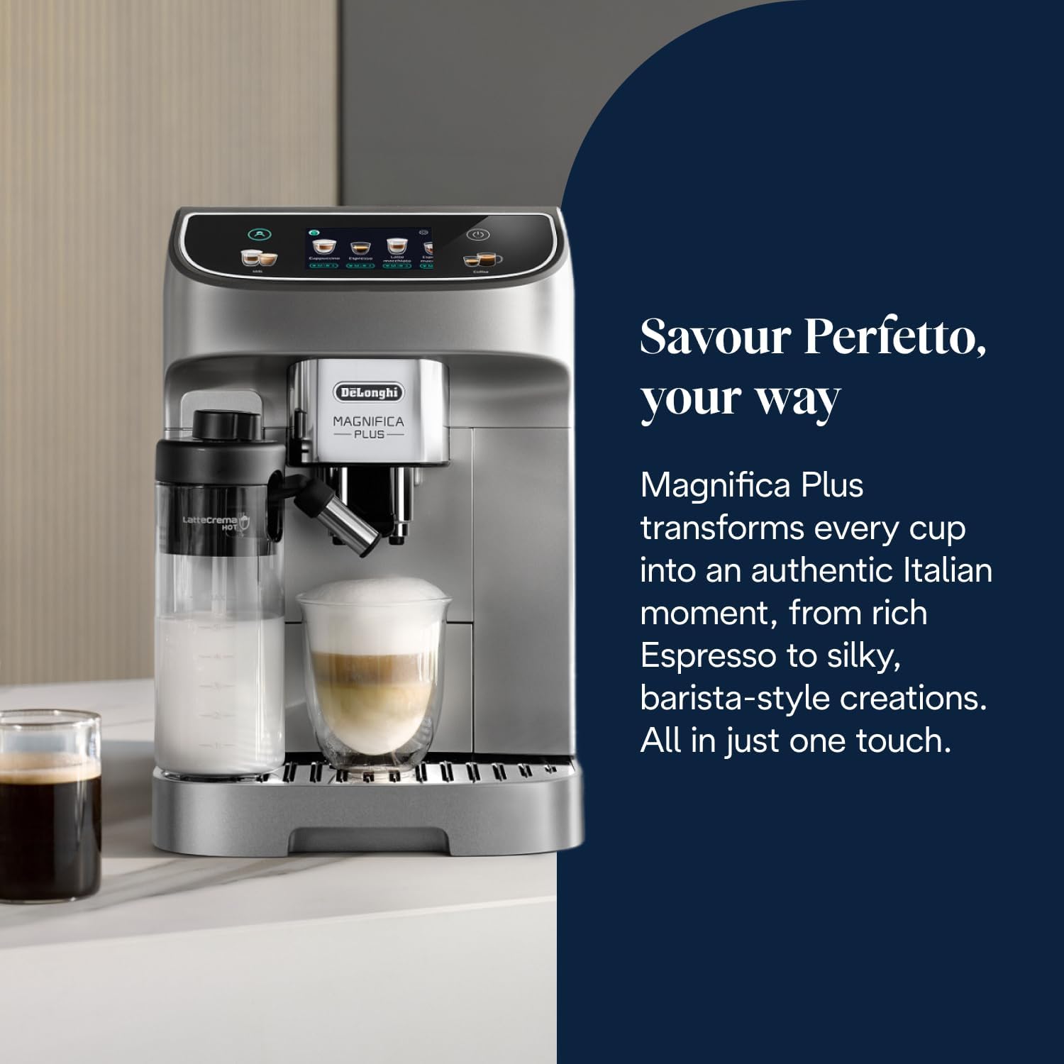 De'Longhi ECAM322.70.SB Magnifica Plus Automatic Coffee Machine with LatteCrema Hot, Bean to Cup Espresso Machine with 18 One-Touch Recipes, Full-Touch Control Panel, 1450W, Silver/Black