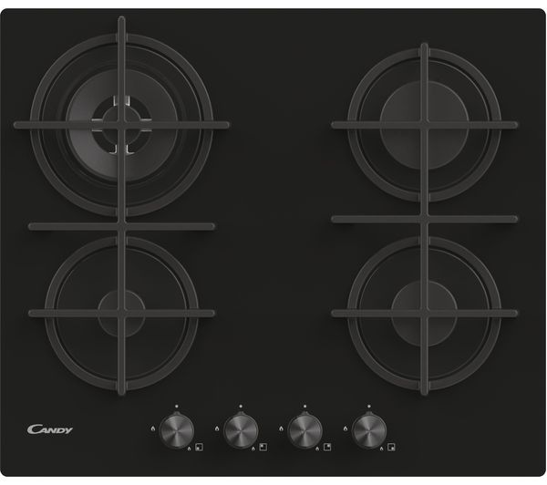CANDY CDK6GR4PBB 60 cm Gas Hob - Black, 9.5 x 59.5 x 51 cm (H x W x D), 4 burners, Cast-iron pan supports, Automatic ignition, Gas on glass, Front-mounted controls