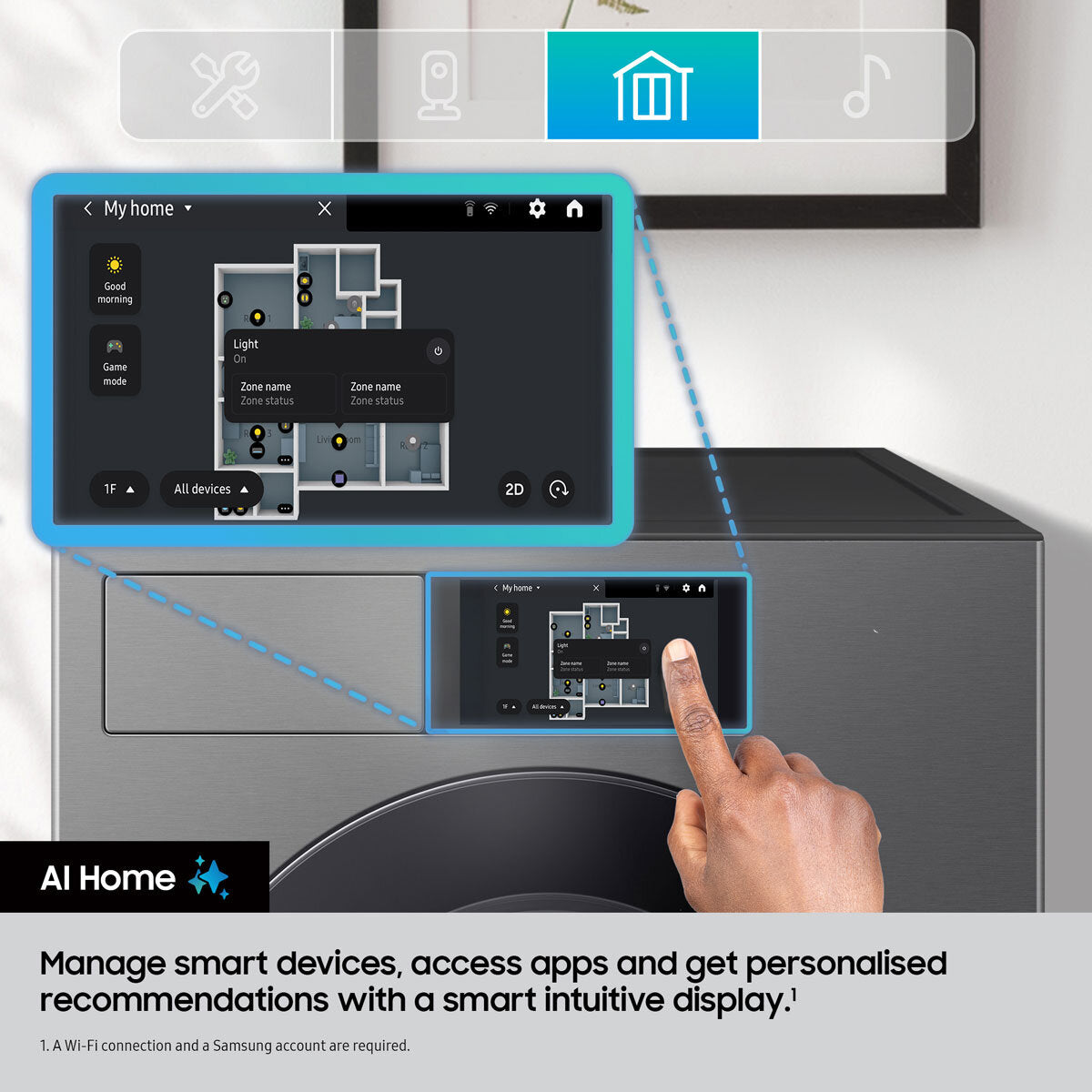 Smart household energy efficiency SmartThings Energy* provides helpful tips on how to be more energy efficient and will notify you if your smart appliances** are accidentally left on. It also lets you easily monitor the energy consumption of devices in real-time, and compare it to the previous month. In addition, you can set monthly targets and receive alerts if they are likely to be exceeded.* Available on Android and iOS devices. A Wi-Fi connection and a Samsung account are required. ** SmartThings Energy currently works with around 40 Samsung home appliances that are SmartThings enabled.