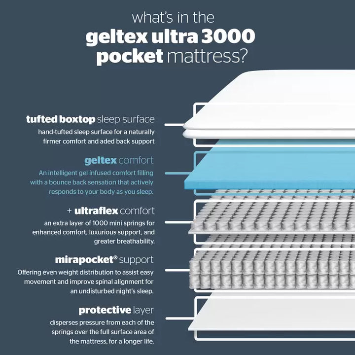 - Advanced 11cm box top comfort layer features Geltex & Ultraflex 1000 mini springs for unrivalled support, luxurious comfort & greater breathability