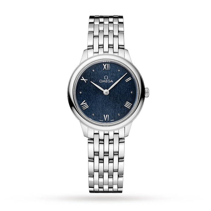 De Ville Prestige- truly timelessPowered by Omega Quartz 4061 calibre movementPresented on a 27.5mm stainless steel case and braceletPVD blue dial with rhodium plated handsWater resistant to 3 bar (30 metres)THE DE VILLE PRESTIGE COLLECTIONCommanding a large, loyal following around the globe, the De Ville Prestige collection is world-renowned for its pure, elegant aesthetic and truly timeless design.With their iconic patterns, finishes, and colours, inspired from classic Omega timepieces from years gone by, these beautiful chronographs have an ageless appeal.SAPPHIRE SERENITYPresented on a sleek stainless steel bracelet is a delicate and dainty 27.5mm stainless steel case characterised by a statement PVD blue toned dial.On the sun brushed dial, rhodium plated hands and alternating Roman numerals and cabochon indexes offer a refined, classic look.Powered by Omega Quartz 4061 calibre movement, and water resistant to 3 bar (30 metres), this watch is further enhanced by a God Chronos medallion embossed on the case back.