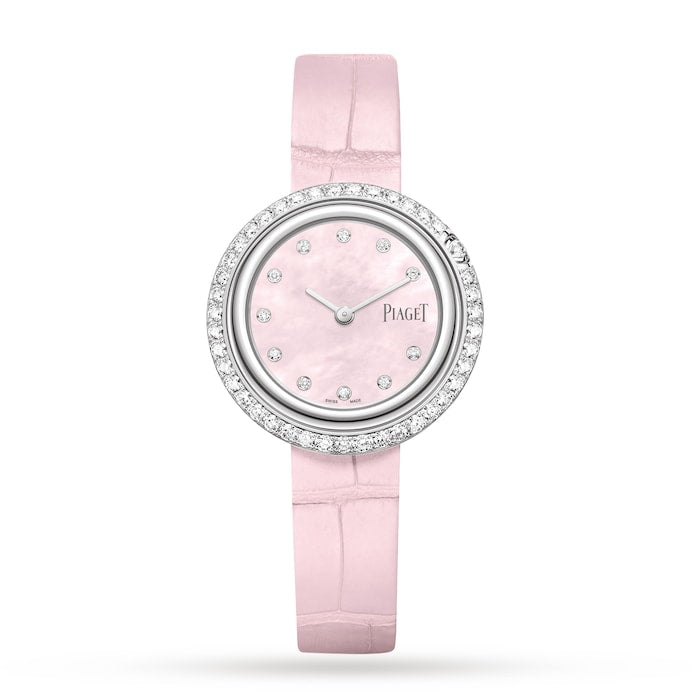 The pink Possession watch with an 18K white gold case, a pink alligator strap and mother-of-pearl dial. A constantly transforming icon. This Swiss women's watch with a Piaget 56P movement has a 29 mm white gold case and light pink mother-of-pearl gem-set dial. The exceptional watch your ensemble is missing. This luxury women's watch has a rotating gem-set bezel and an interchangeable pink alligator-skin strap with an ardillon buckle. Its rotating bezel is a signature emblem of the playful Possession collection, for a spark of joy with each wear. The expertly cut diamonds of this women's luxury watch are illuminated in the light as they turn around the iridescent dial, making time pass with joy and delight.