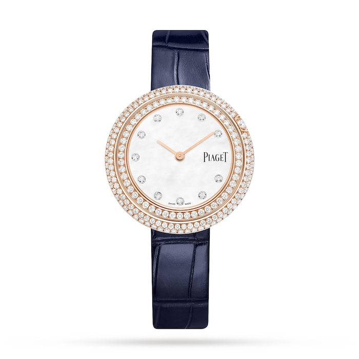 The 34 mm Possession diamond watch with an 18K rose gold case set with brilliant-cut diamonds, and a mother-of-pearl dial. Spend time with an enchanting diamond watch in a 34 mm rose gold case and blue interchangeable alligator strap; made for the women who celebrate the joys of life with every turn of time. The Possession rose gold diamond watch with a mother-of-pearl dial and diamond hour markers features a turning bezel that brings an energising spirit, inspired by those moments of joy, delicate smiles and gentle laughter. Set with diamonds, this bezel sparkles as it turns, and the mother-of-pearl dial reflects the light with its subtle texture. Its interchangeable alligator strap gives you the freedom to wear this luxury watch for women your way, to suit your style. Embrace delight, embrace liveliness, embrace this Possession gold diamond watch.