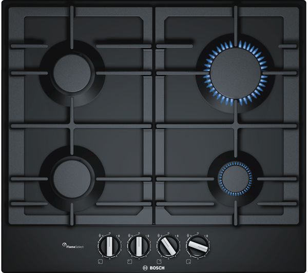 BOSCH Series 6 PCP6A6B90 60 cm Gas Hob - Black, 4.5 x 60 x 58.5 cm (H x W x D), 4 burners, Cast-iron pan supports, Automatic ignition, Precise power selection, Front-mounted controls, 2 year guarantee