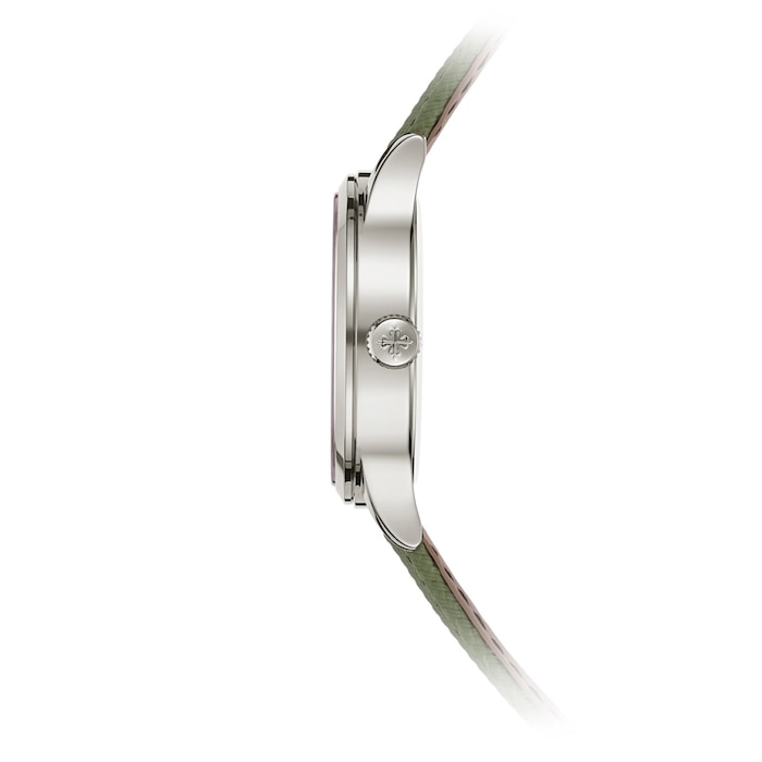 Patek Philippe reinterprets the Calatrava Pilot Travel Time in white gold with an elegant ivory lacquered dial and a khaki green composite-material strap with fabric motif.At the heart of this original, elegant travel watch with an assertive personality beats the 26-330 S C FUS caliber, a self-winding movement distinguished by its easy-to-use Travel Time display system. The date indicated by hand at 6 o'clock automatically adjusts to the local time, whether forwards or backwards.The two time-zone pushers feature a patented safety system designed to prevent accidental disruption of local time.
