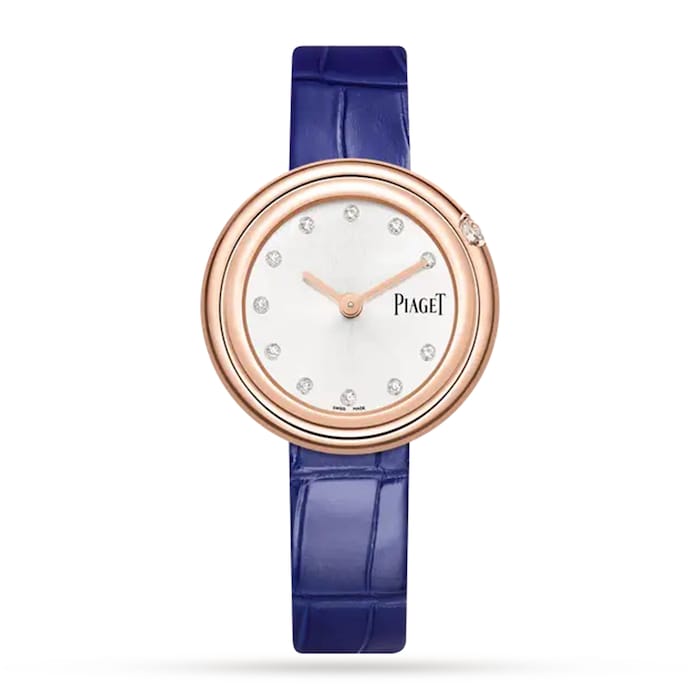 Women’s watch in rose gold and diamonds. Silvered gem-set dial. Rotating bezel. Interchangeable lapis blue alligator-skin strap. A constantly transforming fashion icon, this rose gold and diamond watch takes inspiration from Possession's emblematic turning rings. A halfmoon-set diamond adorns the rotating bezel as it turns mischievously around the silvered dial with gem-set hour markers. The lapis blue alligator-skin strap with a rose gold ardillon buckle brings out the sensually curved 34 mm rose gold case and features an easy interchangeable system so that the wearer can change its style to suit her mood.