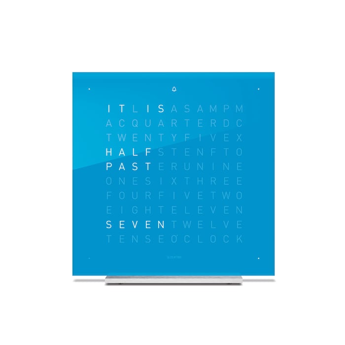The QLOCKTWO TOUCH 13.5 x 13.5 cm is a precision table clock with an alarm function for the office, living-room or bedroom. We remain true to our credo and do everything we can to ensure that innovation and precision find their true size and diversity in minimalism. The front cover of the QLOCKTWO TOUCH is made of polished acrylic glass, with an aluminium body, silver anodized, perfect craftsmanship and true exclusivity. Available in over 20 languages. The front cover is held by magnets and can be easily changed.The typographic font combines the moment with the written word and makes a statement: “IT IS QUARTER PAST SEVEN.” The words change in five minute increments, with four small illuminated corner points displaying the minutes in between. The front cover, is held in place by magnets, making it easily changed at any time. Sensors adjust the light automatically to ambient light conditions so that even at night the clock can be easily read. Also, there is an option for manual brightness adjustment. Simply touch the clock to control key functions; such as night-touch mode, alarm deactivation and snooze mode.QLOCKTWO TOUCH masters more than 20 languages. QLOCKTWO is delivered in the selected language. To display the time in a different language, all you need is another front cover, which is available as an accessory.Please note: With the Arabic language version, the front cover can only be changed within the same language.QLOCKTWO TOUCH FeaturesALARMQLOCKTWO TOUCH can reliably wake you or remind you of an appointment, first gently then with some persuasion. The alarm function is turned on and off by pressing the alarm button at the back of the clock.ILLUMINATIONA light sensor enables the brightness of the LEDs to adjust automatically to the ambient light conditions. The luminosity can also be set manually.NIGHT TOUCHIn this mode the clock is completely dark leaving you to enjoy your night. To read the clock simply touch the surface and the time appears for two seconds.SNOOZEThe alarm rings but you are not quite ready to start the day? Simply touch the top of your QLOCKTWO TOUCH to activate the snooze mode.SECONDSThe seconds are shown as large numbers inside the matrix. In seconds mode the minute points in the corners are still visible.FLASHSETTERWith the QLOCKTWO FLASHSETTER it is even easier to set your QLOCKTWO TOUCH. Alternatively, the time can also be set manually.
