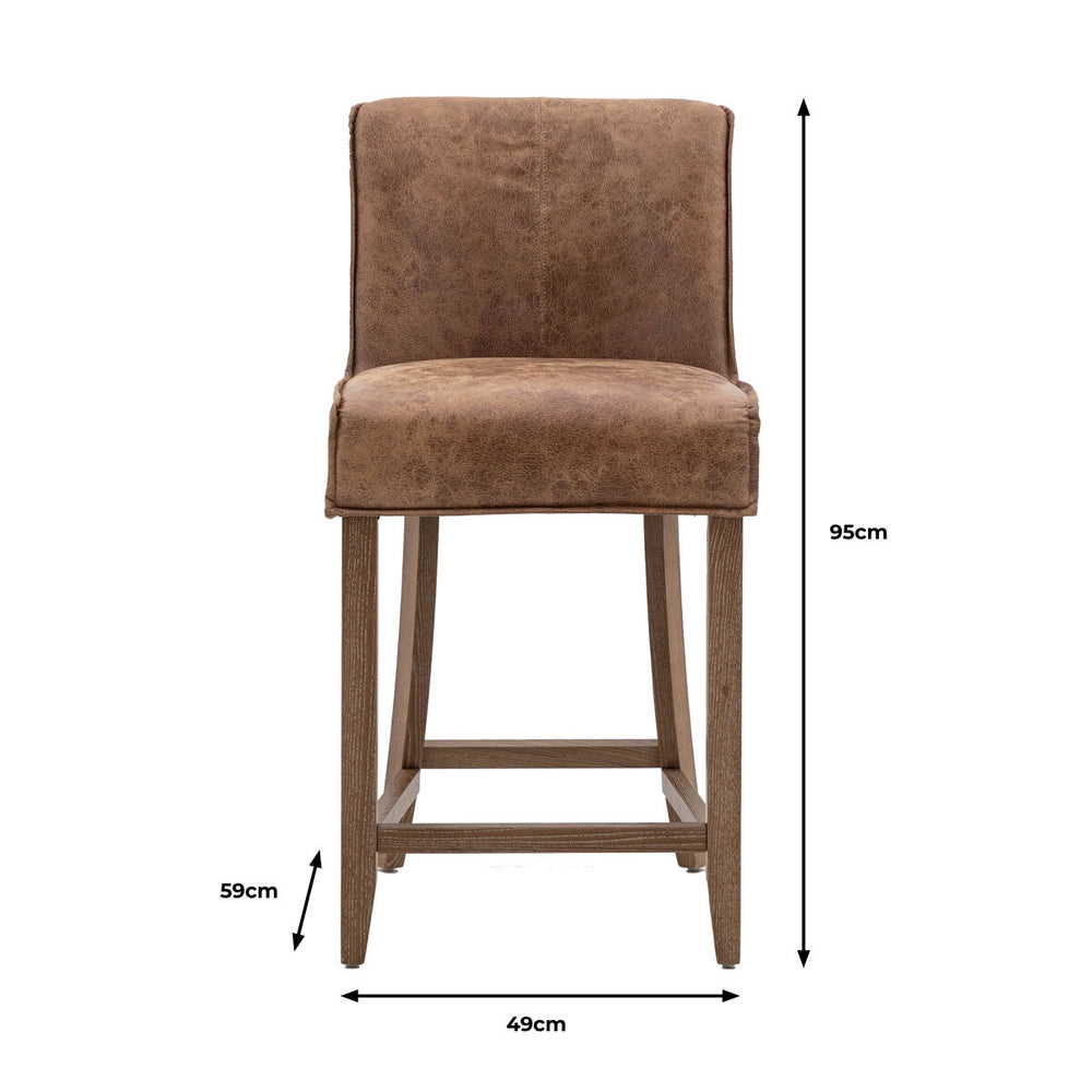 The Tarnby Brown Leather Bar Stools by Gallery are soft and chic, designed to suit a range of interiors with ease. They would look equally at home in modern or vintage spaces. Upholstered in a tan brown leather and finished with softly angled wood legs.