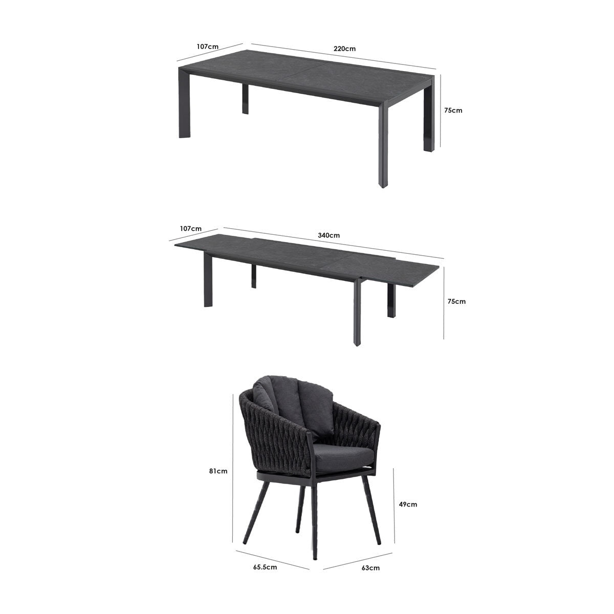 The aluminium framed dining table is just one of the unique features of the Palma. With the ability to extend the table for larger gatherings, this set is perfect for any occasion. As well as this, this substantial yet elegant rectangular dining table is made from rust proof powder coated aluminium, and is topped with an easy to clean ceramic glass. As a result, your table will serve you for years to come.