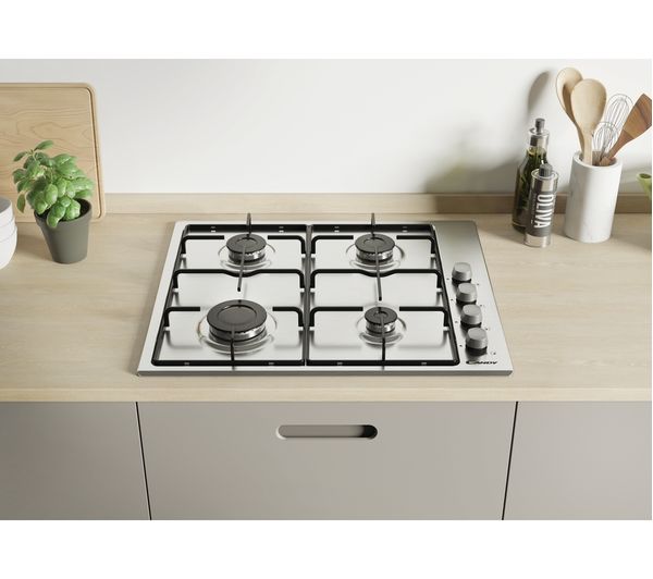 CANDY CHW6LX 60 cm Gas Hob - Silver, 4.3 x 59.5 x 51 cm (H x W x D), 4 burners, Enamel pan supports, Automatic ignition, Side-mounted controls