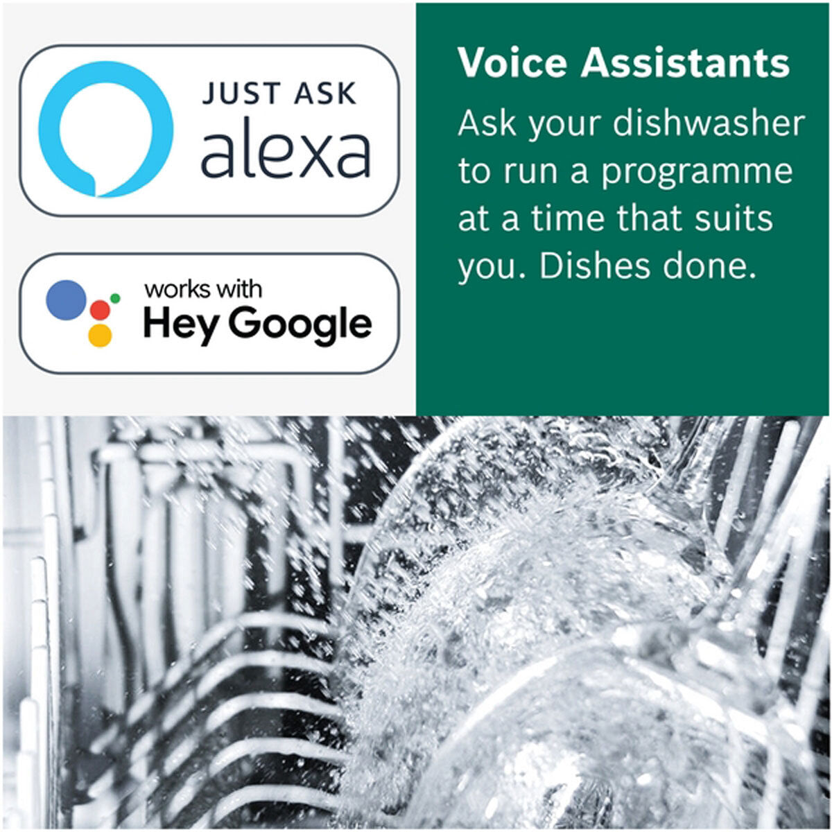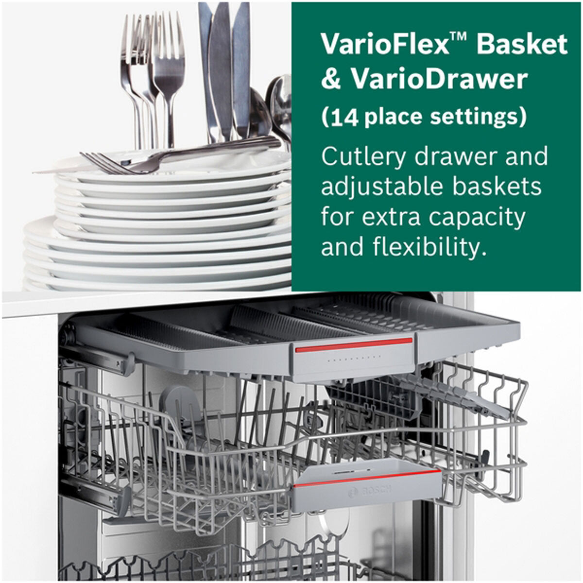 PerfectDry Perfect drying results with low energy consumption. PerfectDry gives you cupboard ready dishes using less energy. Zeolith® technology – unique to Bosch – uses the humidity of the cleaning phase and releases it as warm, dry air drying the drying phase, so even difficult-to-dry items like plastic cups will come out ready to use. SpeedPerfect+ Reduced washing time, perfectly cleaned dishes. Want to speed up your dishwashing? Combine your favourite program* with SpeedPerfect+ to wash and dry your dishes in up to half the time with no need to compromise on cleaning power. You can reduce the remaining program time by pressing the SpeedPerfect button on your dishwasher, or activating SpeedPerfect+ from within the Bosch Home Connect app, even after the cycle has started. *Except: Prewash, Express 45º and Express 65° programmes. Rackmatic Thanks to the triple Rackmatic system, the height of the top basket can easily be adjusted by up to 5cm, or tilted to just one side so you can fit in large pots and tall stem wine flasses, and still fit your large dinner plates on the bottom rack. And you can do this when its fully loaded, givinvg you more adjustment options and maximum flexibility. Vario Drawer Now your dishwasher features high-level flexibility. The sleek and versatile Vario Drawer offers a convenient storage solution for all your kitchen essentials. With its adjustable compartments, you can easily organise cutlery, utensils, and even small pots and pans. The Vario Drawer's smooth gliding mechanism ensures effortless access. Say goodbye to cluttered countertops and hello to a tidy and efficient kitchen. Home Connect An easy solution to help you get the most out of your appliance, with flexible control and additional features.Personalise your dishwasher with up to 10 additional programs with Program Download. Whether you are looking for an intensive cleaning cycle for your dirty dishes, or a silent program for your open plan kitchen, it's even easier to find an option that meets your needs. You can also use the Smart Finish Replenishment service to make sure you never run out of dishwasher tabs. EcoSilence Drive EcoSilence Drive: dishwashing like you’ve never heard before. Keeping the house clean can be difficult. Keeping it quiet can sometimes feel impossible. Our dishwashers with EcoSilence drive deliver high-performance cleaning with low noise emission. Equipped with a brushless, energy-saving motor that optimally reduces friction noise, the EcoSilence drive ensures a much smoother, quieter operation. Now you can enjoy a home that is as quiet as it is clean. ActiveWater Active Water: less water, less energy, better performance. Bosch's innovative Active Water Plus technology maximises efficiency to produce outstanding results whilst protecting the environment. With carefully targeted water distribution, improved filter technology, faster heating and increased pump output for more water circulation, Active Water dishwashers give superb results. Silence Pro 40 dB Extremely quiet dishwashing. Need some extra peace and quiet in your kitchen? The Silence Pro 40 dB dishwasher barely makes a murmur. Keep your kitchen a perfectly welcoming place with Silence Pro. TimeLight TimeLight: exact remaining time is clearly projected onto the floor. Thanks to TimeLight you are informed that your dishwasher is operating and the remaining time of operation is displayed on the floor. In addition also the current progress of operation is shown. Home Connect Home Connect: an easy solution to help you get the most out of your appliance, with flexible control and additional features. Personalise your dishwasher with up to 10 additional programs with Program Download. Whether you are looking for an intensive cleaning cycle for your dirty dishes, or a silent program for your open plan kitchen, it's even easier to find an option that meets your needs. You can also use the Smart Finish Replenishment service to make sure you never run out of dishwasher tabs. AquaStop No more dishwasher leaks. Leak protection is essential for dishwashers. Our AquaStop system delivers fail-safe leak protection. When the sensor detects a leak, the dishwasher automatically stops operating, pumping out water and shuts the separate valve next to the tap. With AquaStop you’re protected from water damage – a promise and a warranty for the lifetime of your dishwasher. *Please find warranty terms under: www.bosch-home.co.uk/customer-service/care-protection-and-parts/additional-warranties#tab-navigation Programme Download Download programmes for a perfect match to your everyday life.Sometimes, it can be tough to find a dishwasher programme that suits your individual needs. Bosch dishwashers with Programme Download offer the possibility to download additional programmes via the Home Connect app. Programme Download ensures perfect dishwashing results thanks to programmes that fit your specific needs. Programme Assistant Smart programme selection Choosing the right programme or each load can be tricky. Programme Assistant makes it easy. Simply answer a few questions in the Home Connect app about the type of load, the level of soiling and personal preferences for energy efficiency, dryness, speed and noise level, and the system recommends the right programme. Then just push start and look forward to your perfectly clean dishware, with minimum effort. Remote Diagnostics Remote support in case of an error. It can be annoying when appliances do not work the way they should. Remote Diagnostics is here to help. Simply call Bosch customer service, and with your permission, we can remotely screen your appliance, locate the issue and give you clear advice on how to solve it. In the event an issue cannot be solved, a Bosch service technician can come to your home to resolve the problem, equipped with all the necessary parts already to hand. Smart support, smart solutions. Automatic Programmes Take the guesswork out of cleaning. Differen