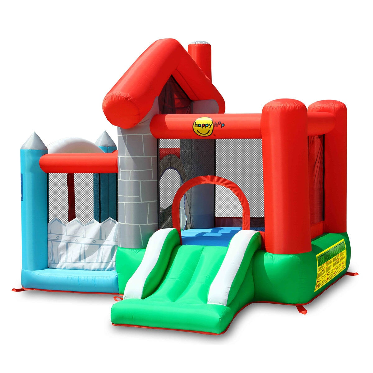 Includes: 1 x Happy Hop Bouncy Castle, 1 x Plug-In Air Blower, Ground Stakes, 30 Plastic Balls, 1 x Carry Bag, 1 x Repair Kit, Instructions