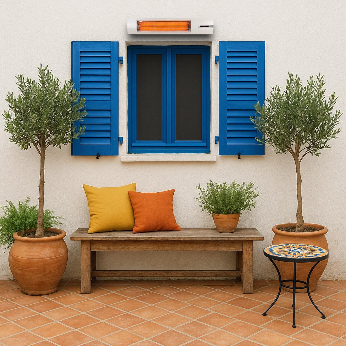 The integrated digital thermostat and remote control allow you to adjust comfort from a distance, while three heat settings (Low, Mid, High) give you flexible temperature control throughout the year. Its IP44 waterproof rating provides all-season protection against splashes and dust, ensuring confident installation — indoors on a wall or outdoors under a canopy.