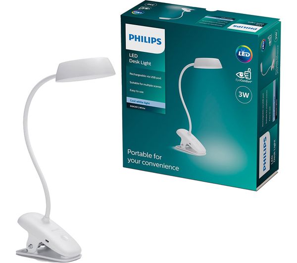 PHILIPS Donutclip DSK201 LED Desk Lamp - White, 175 lumens, Material: plastic & metal, Dimmable, Adjustable arm, USB powered, 2 year guarantee