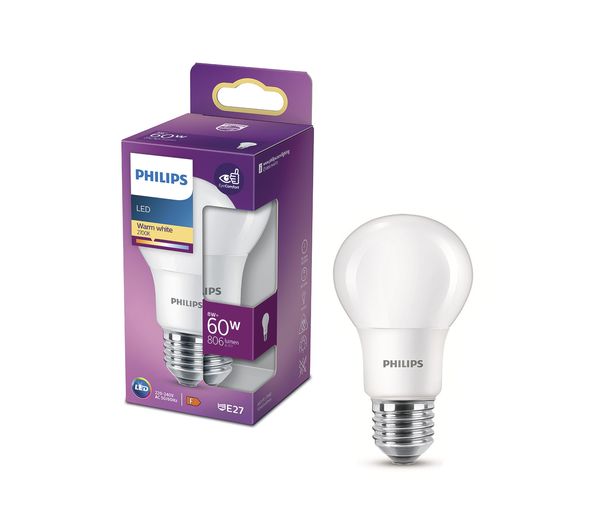 PHILIPS Frosted LED Light Bulb - E27, Warm White, Warm white light, 806 lumens, Equivalent to 60 W, Lifespan: Up to 15000 hours, Voltage: 220 - 240 V