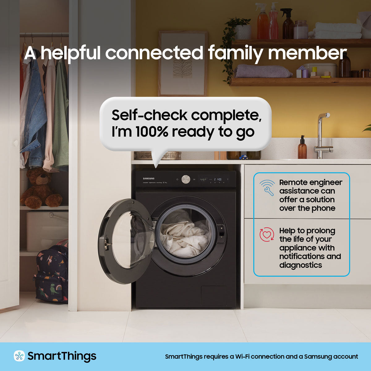 AI Ecobubble™ AI Ecobubble™* creates bubbles removing up to 20% more soil**. It detects fabric type*** and adjusts the amount of bubbles, washing time, temperature and spin speed. Through AI Energy Mode, it saves up to 60% energy.**** With Less Microfiber Cycle, it reduces microplastic shedding by up to 60%*****. AI Control Wash laundry easily and effectively with AI Control. It personalizes washing by remembering your habits, suggesting courses* and displaying timely information. The SmartThings App** offers advice on courses, planning and troubleshooting. And it selects the ideal drying course for each wash***. AI Wash Wash clothes thoroughly* with less waste and effort. AI Wash’s advanced sensing detects the weight and type of fabric (cotton, towel, delicate) of the load and monitors the ongoing level of soiling. It then intelligently adjusts the amount of water and the soaking, rinsing and spinning times. Large Capacity (26kg) Wash many more* laundry items at once – saving time and effort. It has a large capacity of 26kg, so you can fit lots of clothes into a single load, including big items like a king-sized comforter. It means you need to wash fewer* loads and can enjoy more time for yourself. SmartThings AI Energy mode Reduce your washer’s energy consumption using AI Energy mode in SmartThings Energy*. When selected for certain courses**, it reduces energy use by up to 20%*** without compromising the cleaning performance. It uses Ecobubble™ technology to wash at lower temperatures and adjusts the cycle time. Less Microfiber Cycle The Less Microfiber course works to make clothes shed less microplastics, which are discharged into the drain water. By adjusting the motor’s revolution speed and washing intensiveness, the Less Microfiber course reduces the amount of microfiber released into the drain water by up to 60%*. Super Speed Cut your laundry time in half and clean clothes thoroughly. Use Super Speed to wash a full load in 28 minutes*. A powerful water spray helps detergent penetrate fabrics faster and speeds up rinsing. A larger diameter drum cleans with more force and a Swirl+ pattern extracts water effectively. * Based on using a Super Speed cycle with an 11lb DOE (cotton 50% + polyester 50%) load. Wi-Fi Embedded Use your washer easily and effectively with the SmartThings App*, which enhances your washing. Delay End lets you pre-set a wash course’s ending time. And Auto Cycle Link** selects a suitable drying course after a wash. Hygiene Steam Give clothes a deep and hygienic clean. Hygiene Steam releases steam from the bottom of the drum. It removes grime and 99.9% of certain bacteria* and inactivates allergens derived from house dust mites**. Hygiene Steam reduces exposure to house dust mite, cat, dog, grass pollen and fungi***. Self Clean + Keep the inside of the washer hygienically clean and fresh. Self Clean+ removes dirt and odor-causing bacteria in the drum by soaking, pulsating and spinning. A powerful water jet and a high spin speed also remove dirt from the door gasket*. And it notifies you when it needs cleaning**. * Based on internal testing. ** Provides a notification after every 40 cycles. VRT+™ Do your laundry without disturbing anyone. Innovative VRT+™ technology reduces noise and vibration during washes*, even at high spin speeds. A new frame design also provides great stability to reduce noisy movement. And vibration sensing technology detects and reduces vibration from the motor. * Based on internal testing. Compared to Samsung conventional model without VRT+™. EAN: 8806097061427