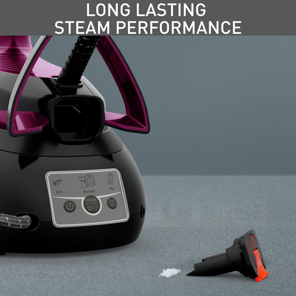 Super-powerful steam delivers fast results. With a generous 6.9-bar pump pressure producing a continuous steam output of 130g/min, the 2800W Express Vision banishes creases in a flash. And stubborn creases don’t stand a chance against its 480g steam boost.