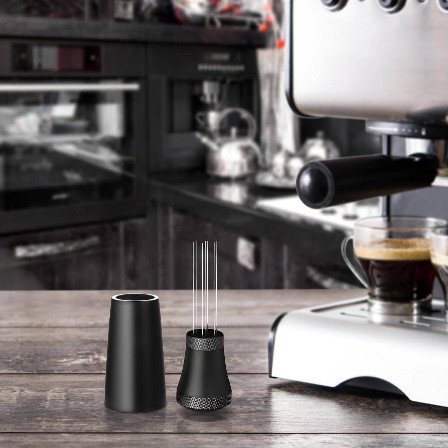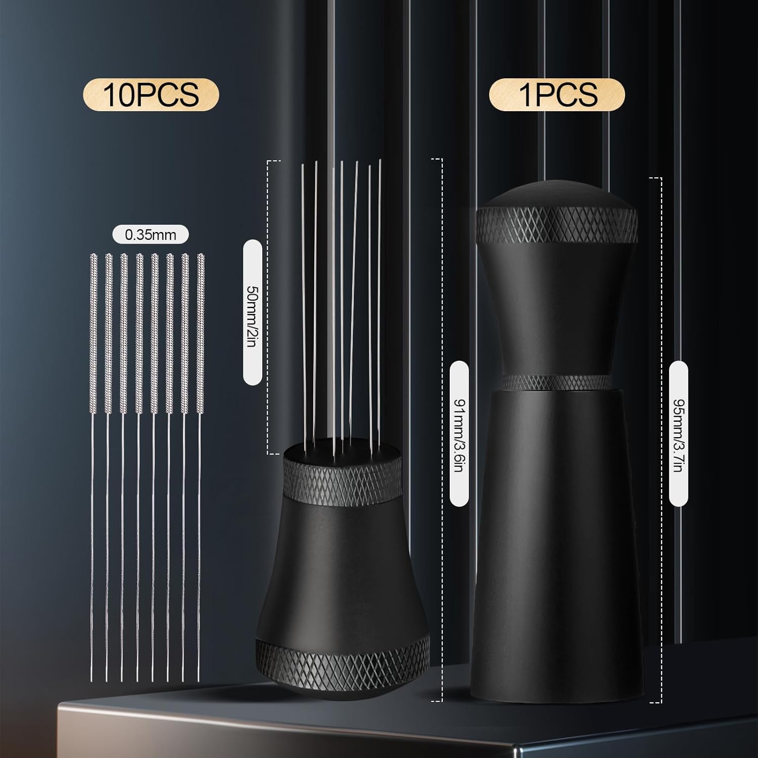 - High Quality The espresso distributor has an aluminum alloy housing, which keeps the needle distributor tool clean and protects the needles from accidental bending. Both the handle and the stand are made of aluminium alloy. The delicate matte surface looks elegant and chic.