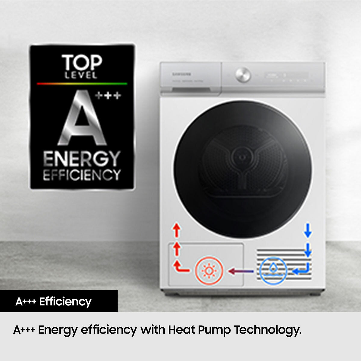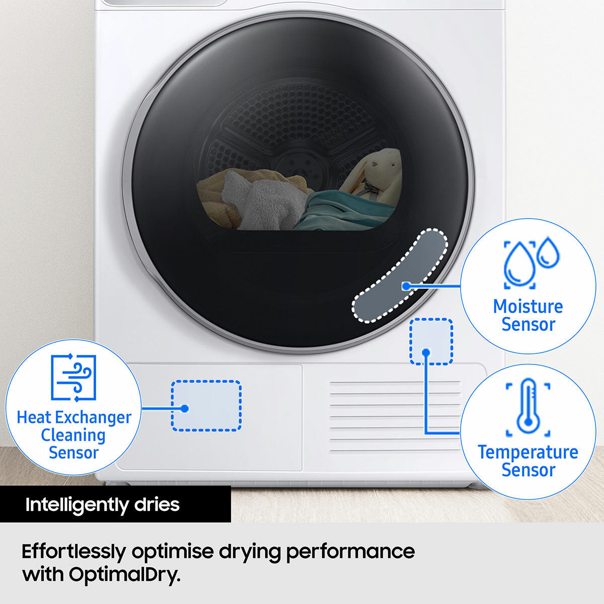 Intelligent drying Dry laundry easily and effectively with AI Control. It personalizes drying by remembering your habits, suggesting cycles and displaying timely information. A SmartThings App provides advice on cycles, planning and troubleshooting. And it selects the perfect drying course for a wash cycle. Dry efficiently and gently Our Heat Pump Technology is the way forward for drying your laundry more efficiently. By reheating the air in the drum, it’s gentler on even the most delicate of delicates. And it means you’ll use less electricity compared to a traditional condenser or vented tumble dryer, making it kinder on your bills and the environment too. Tumble it all away Now here’s a tumble dryer that does more than simply dry your laundry. From towels and bedding to clothes and soft toys, Hygiene Care infuses every load with high temperatures. Even though it’s powerful, it’s gentle on your laundry too. And an added bonus? It works whether items are washed or not. Left or right opening? You decide Feel free to put your Samsung tumble dryer where you want in the home, and adjust the door to work with the space. The reversible door lets you choose if it opens on the left or the right of the tumble dryer. Then it’s easy to load and unload your laundry, and it’s even easier if it’s positioned next to the washing machine. Fewer wrinkles, less ironing Lighten your ironing load with a drying feature that works wonders on smoothing wrinkles and creases. Once your cycle ends on your tumble dryer, select the clever Wrinkle Prevent setting. It will cool the clothes down and rotate the drum. This means your dry clothes don’t sit too long in one place to pick up creases. Then just grab your clothes and you’ll be good to go. Dry out You need to tumble dry but don't want to use too much energy. Our Optimal Dry™ smart technology uses moisture and temperature sensors to adjust the drying time. As well as protecting your clothes from damage, it saves energy too. Double up on drying, not cleaning Looking after your machine will make it last longer and get your laundry nice and dry every time. Maintain your tumble dryer and optimise the drying performance with our 2-in-1 filter which collects fluff, meaning the heat exchange filter needs cleaning less often. And in case you forget, the handy clean alarm reminds you when it needs to be done. A breath of fresh air for your clothes Sometimes our clothes don’t need a full-on wash. They just need a little freshening up between washes. Air Wash is just the thing. Pop in your favourite shirt or that outfit gathering dust in the wardrobe into your tumble dryer. Then a hot, yet gentle air cycle, gets to work deodorising and sanitising. The result? Clothes feel and smell superb – like they’re just back from the cleaners. Dry in no time Need your favourite top dry for an impromptu night out? The 35 Minute Quick Dry cycle dries a load of clothes in just over half an hour. How handy is that? It's ideal for loads of up to 1kg.