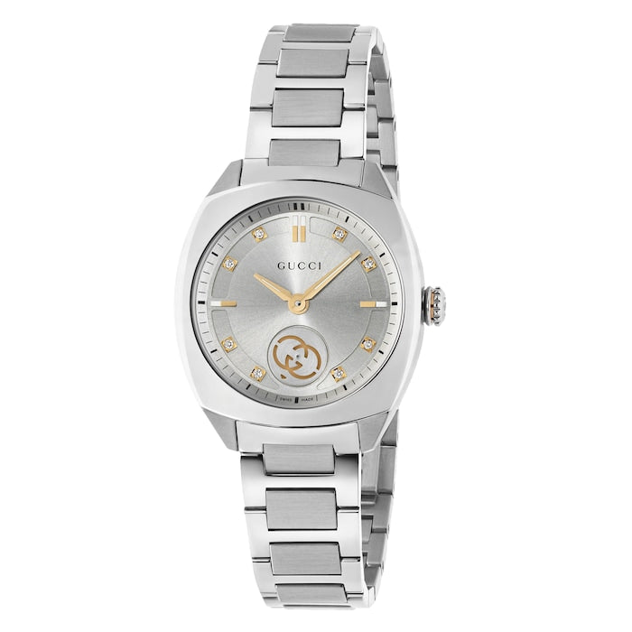 Powered by a quartz movement, the new Gucci Interlocking watch combines the historic codes of the House with a contemporary feel. The style in 29mm case offers a silver sunbrushed dial with diamonds and pink gold-plated details. Finished with a stainless steel bracelet, the accessory is enriched with the signature Interlocking G logo in a small seconds display.29mm stainless steel case, silver sunbrushed dial with 8 diamonds and pink gold-plated details, Interlocking G small seconds display, stainless steel braceletSapphire glass with antireflective coatingThe warranty certificates for Gucci watches purchased after March 1st 2022 are exclusively available online.Download your certificate athttps://watchwarranty.gucci.comby using the serial number engraved on the back of your watch.5 ATM (50 meters/164 feet)Quartz movementWrist size from 130mm to 190mmYA142510Swiss made