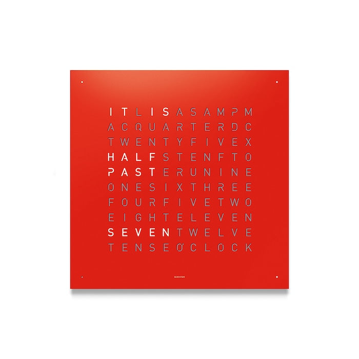 The QLOCKTWO® CLASSIC Steel Wall Clocks 45 x 45 cm makes you stop and look at time in a different way.The typographic font combines the moment with the written word and makes a statement: “IT IS QUARTER PAST SEVEN.” The words change in five minute increments, with four small illuminated corner points displaying the minutes in between. QLOCKTWO CLASSIC appears to float elegantly when wall mounted and if the power connection is visible a coloured textile cable can be added for an additional design element.The front cover, is held in place by magnets, making it easily changed at any time. Sensors adjust the light automatically to ambient light conditions so that even at night the clock can be easily read. Also, there is an option for manual brightness adjustment. QLOCKTWO CLASSIC is available in more than 20 languages.FEATURESILLUMINATION -Sensors adjust the light automatically to ambient light conditions so that even at night the clock can be easily read. The brightness can also be adjusted manually.SECONDS MODE -When the seconds mode is activated – using the two buttons at the back of the clock – the seconds are displayed as large figures on the front matrix. In seconds mode the minute points in the corners are still viable.FLASHSETTER APP -With the QLOCKTWO FLASHSETTER App it is even easier to set your QLOCKTWO.Simple download from your smartphone web store. Alternatively, the time can also be set manually.EASY TO READ -QLOCKTWO displays time typographically in combination with four illuminated points. The words on the clock face change every five minutes. In each corner, illuminated points represent the minutes in between. The introductory words “IT IS“ can be switched on and off. In the selectable „purist mode“, „IT IS“ is only displayed every half and full hour. Example: 7.18 amEASY TO OPERATE -The four buttons to set the QLOCKTWO CLASSIC are positioned at the back of the clock. All the above mentioned functions can be selected using these buttons.INSTALLATION -The QLOCKTWO can be set up in three different ways. A freestanding setup as well as a wall-mounted setup with visible or non-visible power supply are available. All components needed for any of the 3 options are included in the package.WALL MOUNT VERSION WITH VISIBLE CABLE -High-quality textile cable with coloured fabric cable sheath, length 3.5 m. Ideal for wall-mounting the QLOCKTWO CLASSIC without 220 V direct power outlet from the wall. Stages the visible power supply as a design element. Alternative colorfultextile cable QABLE (available as accessories in various colours).ALL MOUNT VERSION -QLOCKTWO appears to float elegantly when mounted. The wall bracket provides plenty of space to hide the cables and the power supply.FREESTANDING -The unobtrusive and nearly invisible base for almost every QLOCKTWO CLASSIC made of matt semi-transparent acrylic glass.AWARD WINNING DESIGN -Since its launch, the QLOCKTWO family has received more than 30 international awards including the Red Dot Design Award, the iF Product Design Award and the ADC Europe’s Gold Award.