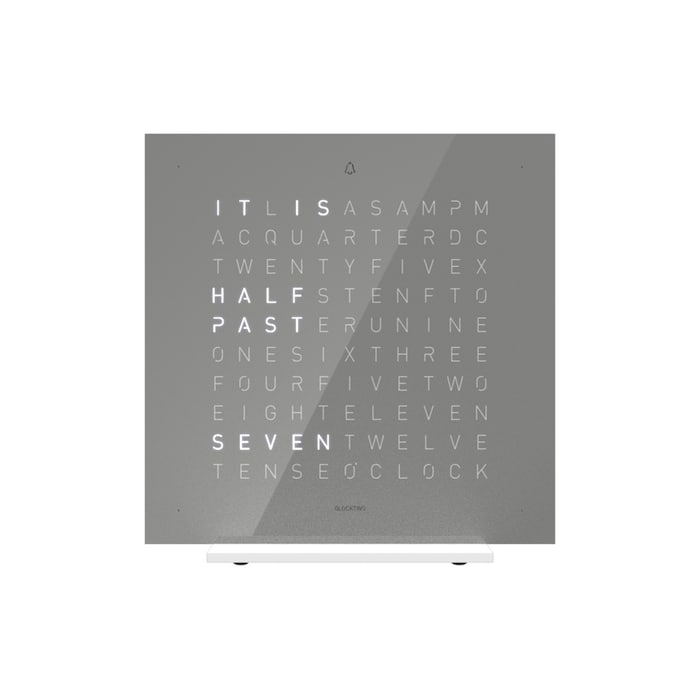 The EARTH is a tribute to the unique cultural heritage of time and our planet. It displays the 24 hours of a day on a word matrix in the languages of our world.The EARTH 13.5 can be presented as a sophisticated accent on the table or sideboard. Equipped with practical functions, such as the night light and seconds mode, the object convinces with its compact format in the unique QLOCKTWO design.The QLOCKTWO EARTH 13.5 PURE EARLY GREY TEA - when diversity moves.Presence and elegance consisting of a white body combined with various acrylic front covers which can be changed according to personal preference and environment.The bright colours of the polished acrylic glass front covers are applied in an elaborate multiple screen printing process. They match perfectly with the white corpus of the QLOCKTWO EARTH 13.5 PURE and let it shine in a completely new light. Available in 6 beautiful colours and more than 20 different languages.Each of these unique pieces is individually numbered. Because every EARTH 13.5 is unique.In addition to the compact format, the simple operation makes the EARTH 13.5 a popular design object. A light touch on the case is enough to control core functions such as Night Touch mode as well as alarm deactivation and snooze.The typographic font combines the moment with the written word and makes a statement: “IT IS QUARTER PAST SEVEN.” The words change in five minute increments, with four small, illuminated corner points displaying the minutes in between.The front cover, is held in place by magnets, making it easily changed at any time. Sensors adjust the light automatically to ambient light conditions so that even at night the clock can be easily read. Also, there is an option for manual brightness adjustment.QLOCKTWO EARTH 13.5 is delivered in the selected language. To display time in another language, you simply need the respective front cover, which is available as an accessory. QLOCKTWO EARTH is available in more than 23 languages.Please note: for the Arabic version, the front cover can only be changed within the same language.SECONDSThe seconds are shown as large numbers inside the matrix. In seconds mode the minute points in the corners are still visible.NIGHT TOUCHIn this mode the clock is completely dark leaving you to enjoy your night. To read the clock simply touch the surface and the time appears for two seconds.ILLUMINATIONA light sensor enables the brightness of the LEDs to adjust automatically to the ambient light conditions. The luminosity can also be set manually.ALARMQLOCKTWO EARTH 13.5 can reliably wake you or remind you of an appointment, first gently then with some persuasion. The alarm function is turned on and off by pressing the alarm button at the back of the clock.SNOOZEThe alarm rings but you are not quite ready to start the day? Simply touch the top of your QLOCKTWO TOUCH to activate the snooze mode. – this isn’t on there websiteFLASHSETTER APP – download able from App storesWith the QLOCKTWO FLASHSETTER it is even easier to set your QLOCKTWO EARTH 13.5. Alternatively, the time can also be set manually.