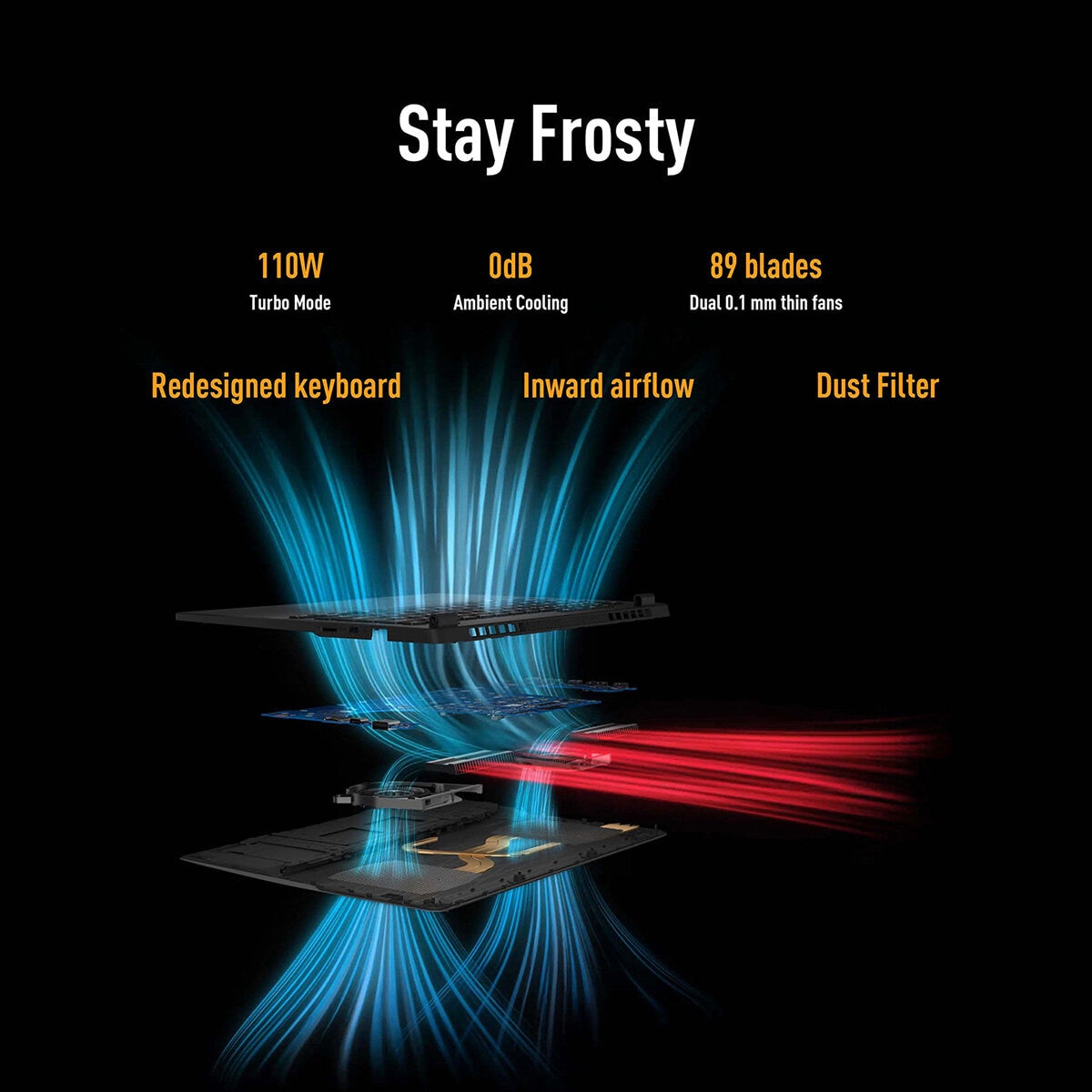Stay frosty Powerful components require powerful cooling, and the TUF Gaming A14 is capable of 130W TDP in Turbo mode. So we equipped the machine with a whole suite of technology to keep it running at peak performance. The keyboard has been redesigned to increase airflow and reduce surface temperatures, and when paired with ultra-thin heatsink fins and 89-blade fans, the A14 will be running at peak performance for years to come.