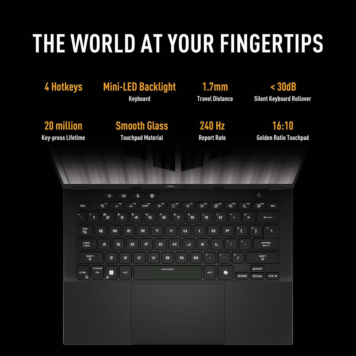 THE WORLD AT YOUR FINGERTIPS Arm yourself with a desktop-style keyboard optimized for gaming. Uniform Mini LED backlighting lets you brilliantly express your own unique style. Overstroke technology triggers higher in each keystroke for faster responsiveness and effortless control. In true TUF form, each key is durable enough to withstand over 20 million presses for superb long-term reliability and precision. The TUF Gaming A14 sports a glass topped touchpad, enabling smooth scrolling with quiet clicks. The touchpad also has a report rate of 240Hz, giving the system more information on what you’re scrolling for and reducing accidental misclicks.