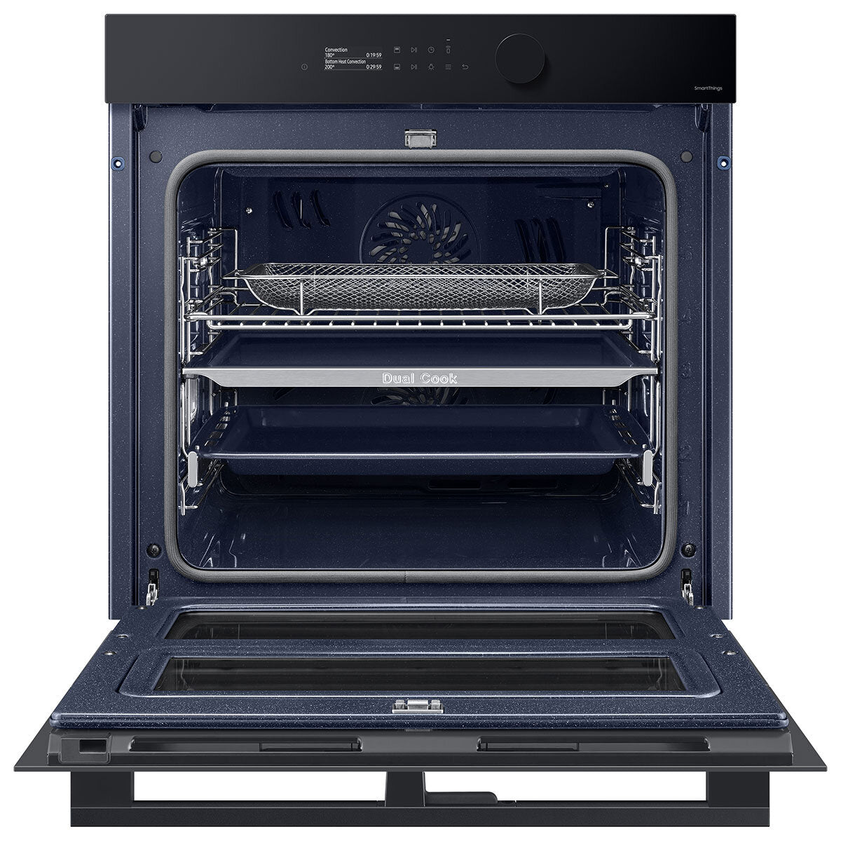 2 small or 1 big oven Cook different meals more flexibly and efficiently. Dual Cook Flex’s upper and lower zones work independently. Use just the top for smaller dishes, both together with different temperature and time settings or the whole oven for large dishes. And a hinged door lets you access the top easily. One door. Two ways. Enjoy complete flexibility to cook various dishes with a hinged Flexible Door. Just open the top half to use the upper zone for small meals. It makes it easier to check on dishes and season food, with less heat loss. Or open the whole door to use both zones when cooking many different foods. Healthier fried food Enjoy healthier fried food without a deep fryer. Air Fry combines a special tray with hot air circulation that envelops food. It is the ideal way to cook French fries, Tater Tots or even vegetables as it eliminates excess fat, but everything is still crispy and brown outside and juicy inside. Simply more intuitive Enjoy a hassle-free cooking experience with intuitive and personalized control. The modernized design has a stylish control panel with a 4.3" LCD display, touch control and a single knob. Based on your usage patterns, it shows the most frequently used options, which can be quickly selected. Always keeps the oven neat with heat Keep the inside of your oven neat and clean without wasting time and effort scrubbing or using costly cleaning products. A Pyrolytic Cleaning system heats the cavity to burn off any grease and residue left from cooking. Everywhere is left spotless with only a few ashes to wipe away. More joy, less burden Make your kitchen experience more joyful. SmartThings Cooking saves time and minimises the burden of cooking. By understanding your needs, it recommends personalised recipes and creates a weekly meal plan. It also offers a guided cooking experience and enables effortless grocery shopping. Totally even cooking Cook food more evenly without it overcooking or drying out. An Air Sous Vide* system accurately senses the temperatures in each cavity and maintains an even temperature for a long period. So everything is cooked thoroughly, wherever it is in the oven, and tastes deliciously tender and juicy. Cook much more Create more and larger dishes with a massive 76 litre capacity oven. It opens up more possibilities in home cooking. You can prepare lots of different food together, like everything you need for a party. Or it can easily accommodate large items, like a king-size turkey, for a family gathering. Remarkably Efficient Make your home more energy efficient. You can use the whole oven and enjoy exceptional A+ rated energy efficiency with the Eco convention mode. It saves energy by using less power, but you still have the convenience of a very large and flexible oven space. And it reduces harmful CO2 emissions. Smooth gliding shelf Get things in and out of the oven much more easily. The Telescopic Rail slides in and out smoothly with hardly any effort, even if you’re using large or heavy pans. It creates much less friction, so it’s much easier to load and unload. And you can baste, turn and season food without any spills. EAN:8806094337655