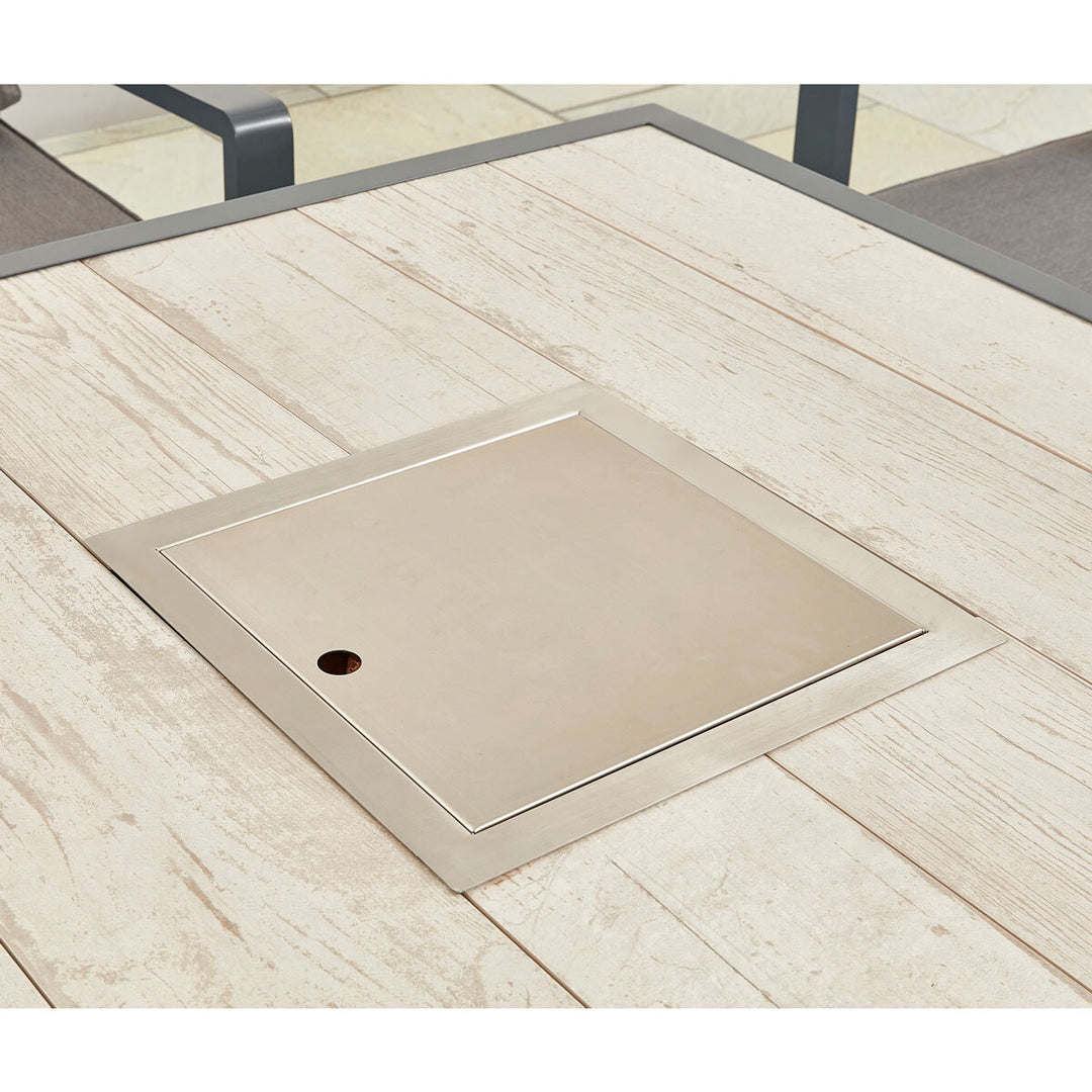 Constructed from rust-resistant aluminium from the UK, the fire table also includes a glass barrier around the fire pit, providing protection against weather. This allows you to keep the conversation going, whatever the weather. The fire pit is compatible with 5kg gas bottles (not included).