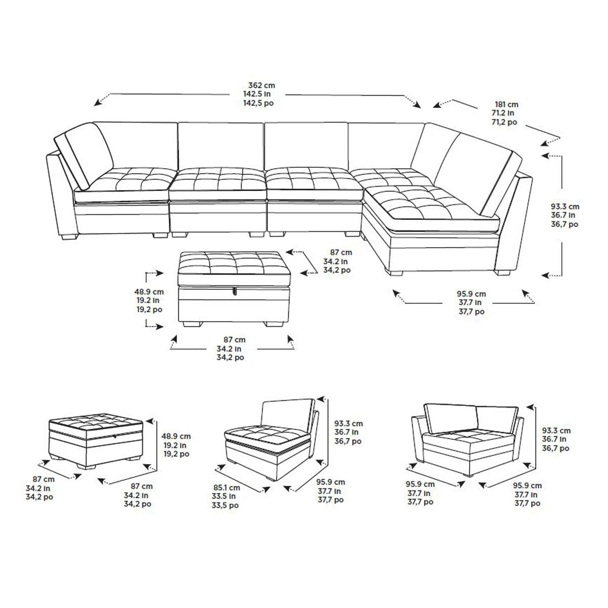 - Modular pieces can be arranged in multiple configurations