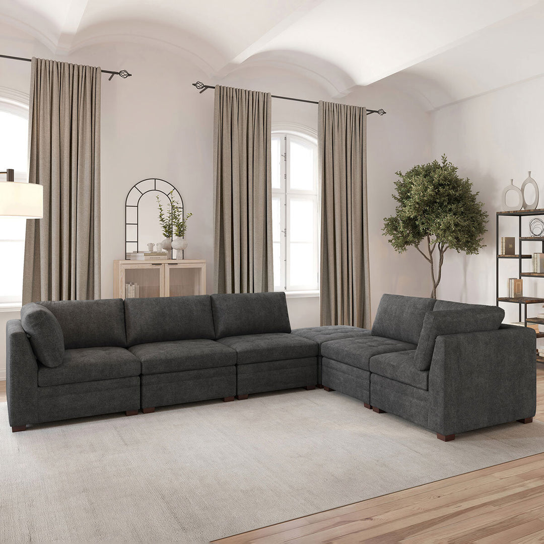 The Thomasville Tisdale Dark Grey Fabric 6 Piece Modular Sofa with Storage Ottoman can be arranged in multiple configurations to provide a custom fit for your space. The ottoman top pulls up to reveal a generous storage compartment to stash throw blankets, remotes, and more. The comfort of this modular sectional goes beyond the soft to the touch fabric and into the cushion construction due to the supportive no-sag spring system. The back cushions are removable, which allows for easy cleaning and fluffing when needed. A subtle yet stunning tuft design adorns the seat cushions and ottoman while solid wood legs, in a rich walnut brown finish, complete the frame. The versatile design of this sectional can easily transition from contemporary to traditional spaces while the large scale provides optimal comfort for sitting and lounging.