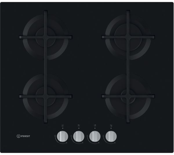 INDESIT ING 61T/BK UK 59 cm Gas Hob - Black, 4.9 x 59 x 51 cm (H x W x D), 4 burners, Cast-iron pan supports, Automatic ignition, Gas on glass