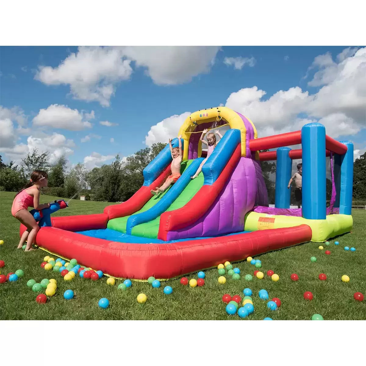 The BeBop Total Wipeout really is the best of both worlds. A double lane water slide with splash pool and large bouncy castle all in one! Fabulous fun used as a dry bouncy castle or easily turn the Total Wipeout into a wet and wild splash park in minutes. Boasting an over slide water spray feature and super squirting water cannon, the water tubing supplied fits quick and easily onto your standard garden hose attachment. Inflation and set up is fuss free and takes only 5 minutes!
