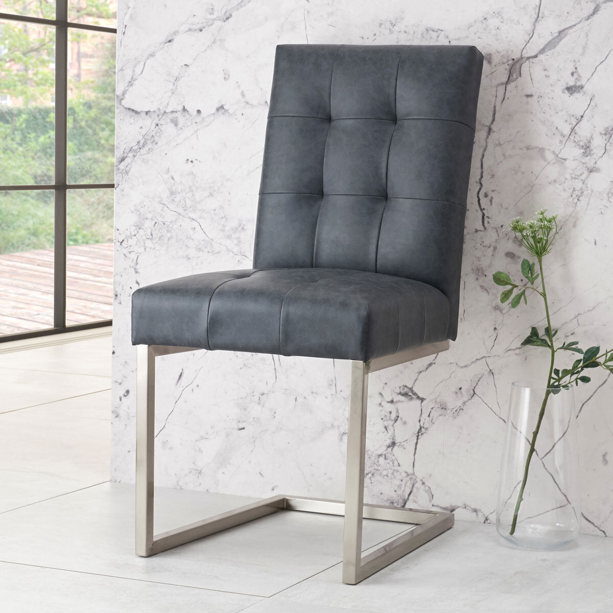 The Tivoli cantilever chairs by Bentley Designs are upholstered in mottled black faux leather giving them a chic and on-trend look. They feature bold square pattern stitch details and have a handle in the back and superior glides on the base for ease of manoeuvre.