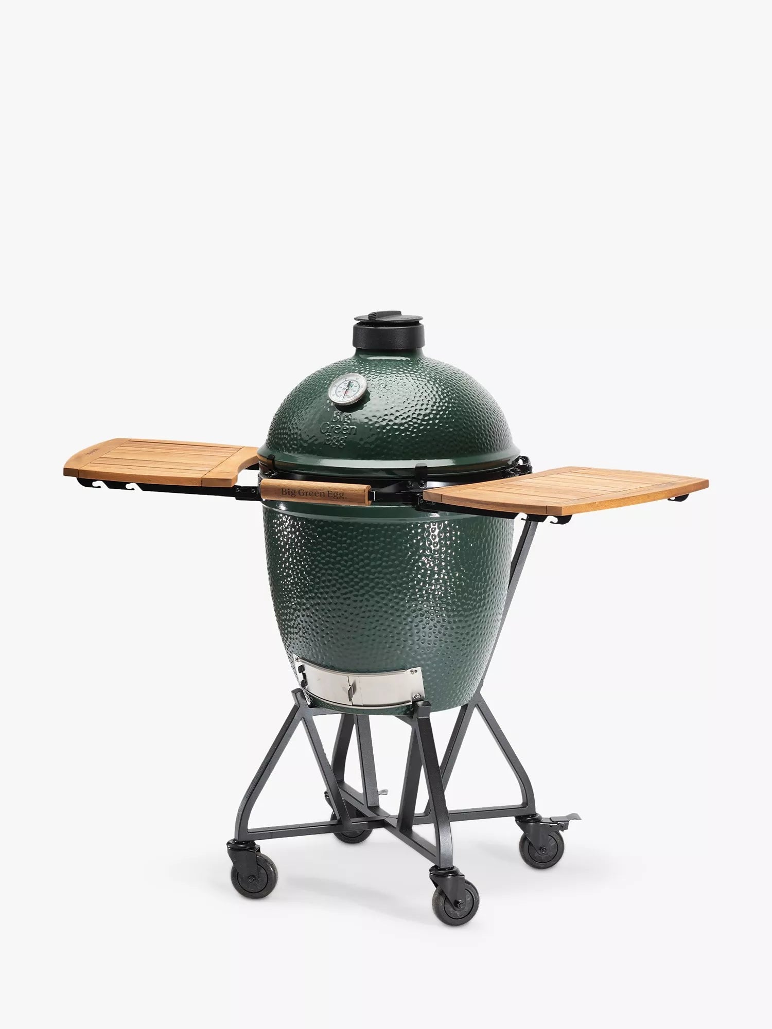 This large Big Green Egg bundle includes two acacia wood shelves for food preparation and a nest with transporter wheels. The Egg has a large gauge for keeping an eye on the cooking temperature. The shelves fold for easy storage and the transporter wheels make it simple to move the Egg around your outdoor space. The included cover protects the stand and Egg when not in use.