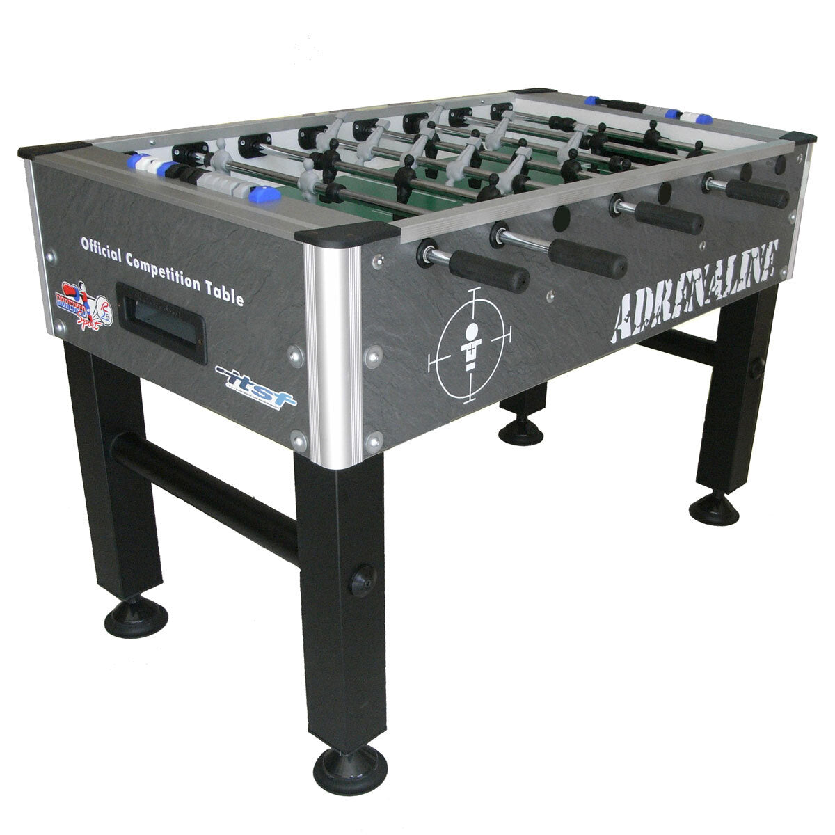 The Roberto Sport Adrenaline is a table that has been developed with advice from professional international players. This table introduces new techniques allowing for an outstanding performance. A special renovated mix of rubber springs are used, instead of the traditionally used ones, allowing a better absorption of the shot’s impact and eliminates the blind areas since it prevents the passage of the ball between the board side and the playing figures. Both the laminated plastic playfield alongside the round grind anti slippery feet of figures grant perfect control of the ball.