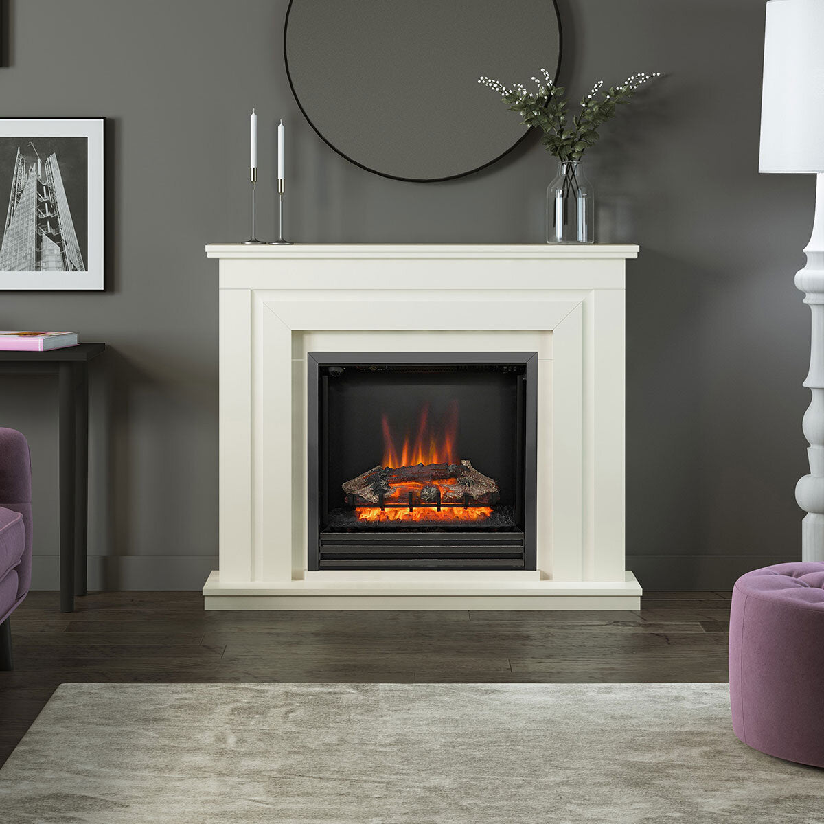The realistic glowing log bed set in a log basket and the bold profile of the fireplace surround add depth and character with a traditional style.