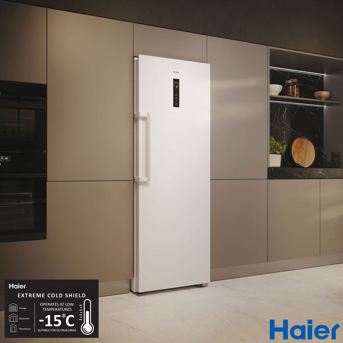 The Haier InstaSwitch has great capacity for loads of of frozen goods. Not to mention that with the touch of a button, the InstaSwitch technology allows you to swap between a freezer which can reach temperatures of -24°C to a fridge at 2°C. Freezer or fridge, the choice is yours… Description * Turning your freezer into a refrigerator? It’s very simple, just a click and you can bring the temperature from -24° C to + 2° C. For maximum performance, practicality, and flexibility. Suitable for -15° temperatures Wherever this freezer is installed in, it will continue to work perfectly, even in indoor environments with temperatures as low as -15°, like garages, basements or outbuildings. Innovative technology for effortless maintenance Haier’s highly innovative Total No Frost technology cleverly prevents the formation of frost in your freezer protecting your frozen foods and preventing unnecessary energy loss. Now you’ll never have to defrost your freezer again. Maintaining your freezer has never been so easy! Anticipate your freshness needs Thanks to hOn app, Artificial Intelligence and wifi connectivity, Haier offers innovative functions that anticipate your need for freshness. Control your appliance remotely. Stay in total control thanks to the External digital display A stylish and easy-to-use digital touch screen allows you to control the conditions inside your freezer without opening the door. This prevents unnecessary temperature fluctuations, which in turn increases efficiency and preserves the quality your frozen goods for longer. See things more clearly, with LED interior lighting A powerful led light positioned at the top of the appliance ensures a clearer view of the internal compartments, allowing you to use the refrigerator effortlessly no matter the amount of external light. E Class Choosing Haier’s E Class freezers means saving energy, improving performance efficiency and respecting the environment. -20% consumption compared to the F Class. EAN: 6930265326215