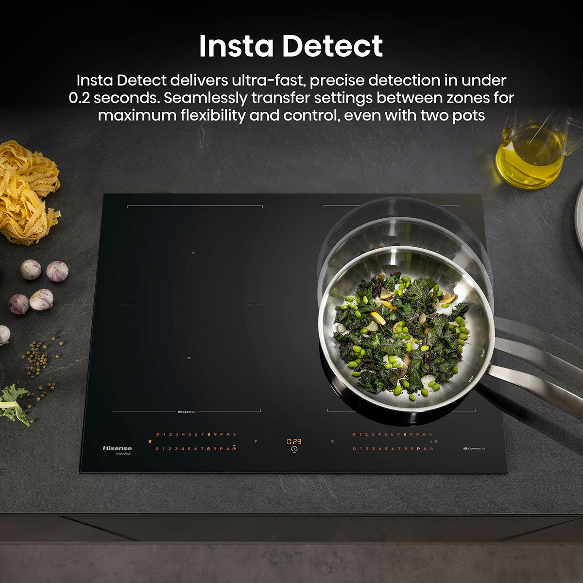 Multi-Zone Illuminated Touch Sliders Experience effortless control with multi-zone illuminated touch sliders. Adjust power levels with a simple touch, while the sleek, illuminated design ensures precise control and adds a modern touch to your kitchen. Whether you’re cooking with one zone or multiple, these intuitive sliders make it easier than ever to customise your cooking experience. Enjoy the perfect blend of style and functionality, all at your fingertips. Auto Programmes Equipped with six automatic programmes – melt, warm, boil, simmer, grill and fry this hob can take the guesswork out of cooking. Each zone features its own temperature sensor, which accurately monitors the glass surface to ensure optimal heat control for every task. Whether you’re gently melting chocolate, keeping food warm or bringing liquids to a rapid boil, the hob automatically adjusts to the perfect temperature with just the touch of a button. Enjoy consistent results and a more efficient cooking experience, freeing you from constant adjustment and allowing you to focus on other tasks. Area Flex With Area Flex, you’re no longer limited to standard-sized cooking zones; simply connect two zones together to create an expansive cooking surface that adapts to your needs. This feature allows you to accommodate larger pots, pans or even multiple smaller cookware at once. Whether you’re preparing a big family meal or experimenting with a variety of dishes, area flex ensures you can handle it all with ease. Insta Detect Insta Detect ensures your cooking with ultra-fast, precise detection in under 0.2 seconds, ensuring even smaller pots receive optimal heat. The innovative setting transfer function lets you seamlessly move pots between zones while maintaining settings like power and time, even for two pots at once. This feature offers maximum flexibility and control in your kitchen. Heat Shift Say goodbye to the limitations of traditional cooking methods and embrace a seamless transition between various cooking tasks. With heat shift, you can effortlessly move pots and adjust settings across multiple zones while ensuring consistent cooking conditions throughout.   Gentle Heat Technology Experience precision with our Gentle Heat technology, which ensures a uniform heat supply across all levels, eliminating temperature fluctuations. This innovative feature provides consistent heat for delicate dishes, such as melting chocolate or slow-cooking stews, preserving the perfect texture and flavour. Enjoy precise temperature control, making every meal a masterpiece – whether you’re preparing fine sauces, simmering soups or gently warming ingredients. Wi-Fi Connectivity Unlock the power of smart cooking. Simply download the ConnectLife app and link your hob for effortless monitoring, push notifications and access to a variety of automatic programmes. In addition to warm, melt, boil, simmer, grill and fry, you can enjoy an additional defrost programme directly from the app. Choose your recipe, select the corresponding programme and confirm it with a simple tap on the hobs WiFi symbol. With over 100 guided recipes, cooking has never been easier – just pick a recipe, choose your cooking zone and press start. The hob automatically adjusts power levels, so you don’t have to worry about fine-tuning settings. Plus, set timers directly on the cooktop or within the app and receive notifications when it’s time to add ingredients – like when the water is boiling for pasta. Easy Installation The hob features a pre-installed gasket seal for seamless integration, eliminating the frontal gap. This advanced technology ensures durability, a secure fit and easy installation for long-term performance. Power Management Designed for any setup - your induction hob power settings can be adjusted to suit older installations or limited capacity. Intelligent power management ensures efficiency and safety without compromising performance. Rapid Boil Need an extra burst of heat? Activate rapid boil. This setting is perfect not only for boiling pasta but also for searing steaks and flash-frying seafood. After 5-minutes of intense heat, the temperature automatically reduces to a low simmer, giving you precise control for perfect cooking every time. Recall Assist With recall assist, your hob remembers your previous cooking settings, so you don’t have to adjust everything from scratch. Whether you’re simmering a sauce or searing a steak, simply recall your preferred temperature and power levels for perfect results every time. This convenient feature saves your time and effort, ensuring consistency in your cooking while providing a seamless experience. Stop and Go The stop and go feature offers ultimate convenience by pausing your cooking with a single touch, allowing you to step away without losing your settings. When you’re ready to resume, simply press again and your hob picks up right where you left off. Perfect for those moments when you need to multitask, stop and go ensures your meal is cooked to perfection without any hassle. Timer Enjoy complete control while cooking with the integrated timer. The final audible signal lets you know when the hob is automatically turning off, so your meal is perfectly timed and ready to serve. EAN: 3838782863318