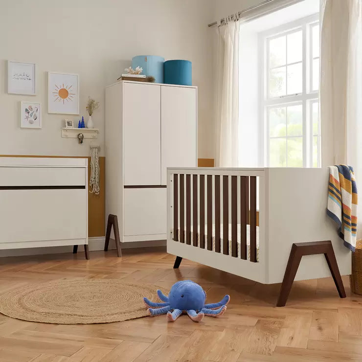 Meet the Fuori 4 Piece Nursery Set – a Scandinavian-inspired blend of modern simplicity and functionality. With exposed legs and a sleek appearance, it’s an ideal choice for those who desire a clean, contemporary nursery look. Practical and versatile, this set includes a cot bed that converts to a toddler bed or sofa with sprung mattress, a chest changer and a wardrobe with ample storage for all your baby’s essentials.