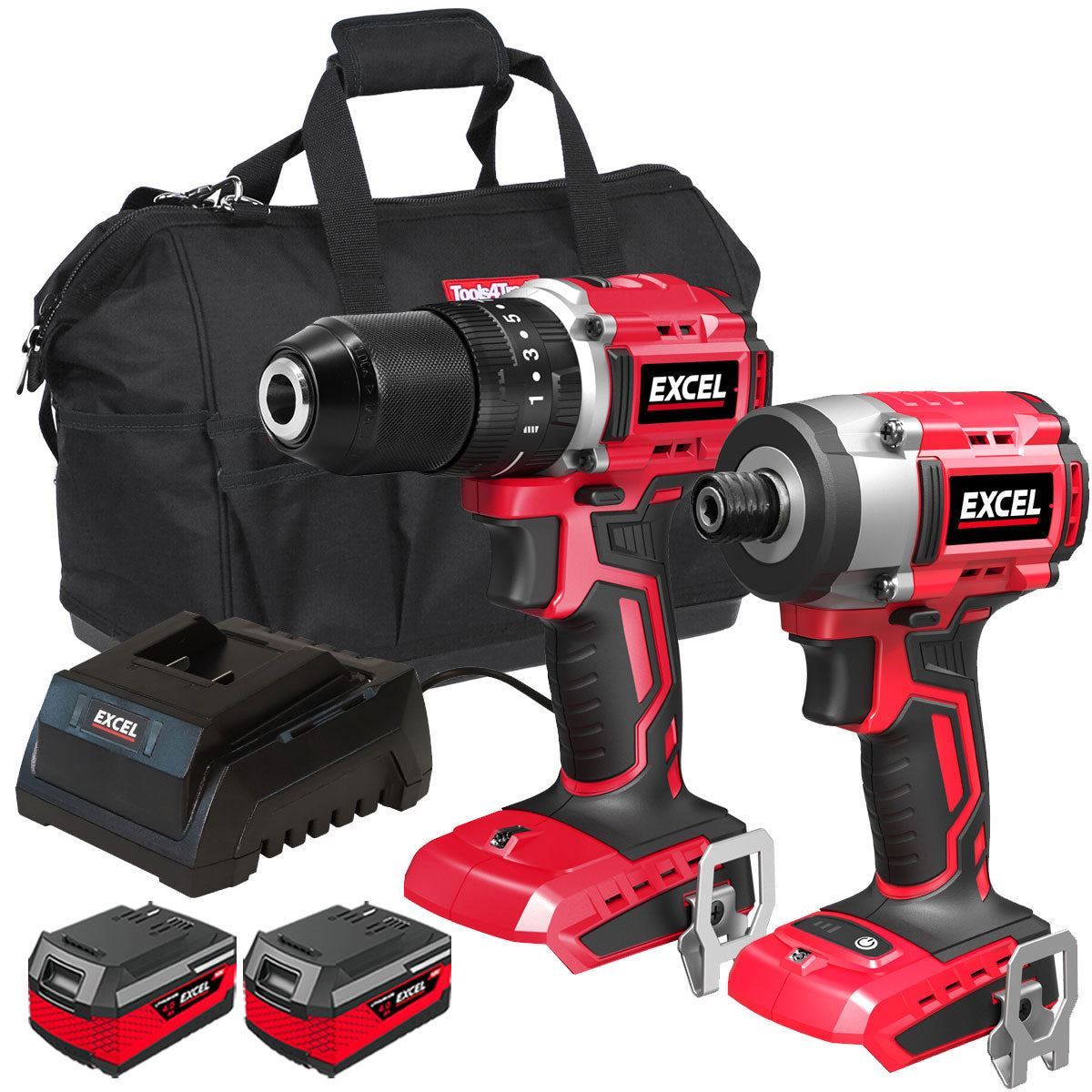 Excel 18V Brushless Twin Pack Impact Driver & Combi Drill with 2 x 4.0Ah Battery & Charger