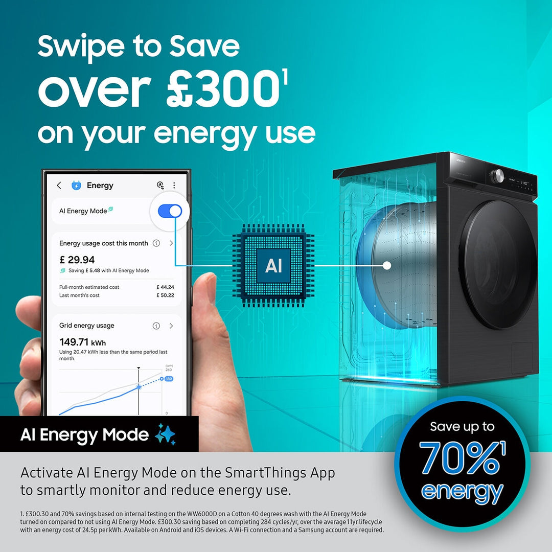 AI Ecobubble™ AI ecobubble™ technology is one of our brilliantly useful features designed to make laundry less of a chore. Activated on Cotton, synthetics and AI Wash programs for up to 2kg loads, AI ecobubble™* mixes air, water and detergent to cleverly create bubbles that wash your clothes at cooler temperatures. All while detecting the type of fabric and optimising the amount of bubbles, washing time, temperature and spin speed. SpaceMax™ Get the same footprint washer dryer but with an extra 2kg drum inside! Thanks to a complete interior redesign, our washer dryer now holds a large drum boasting a whopping 11kg capacity while the outside dimensions stay the same. Performance Super Speed (39) Bottomless laundry basket? Take the load off and power through your wash in just 39 minutes for a full clean. Whether it's the forgotten PE kit or that last minute outfit, you can spend less time washing and more time wearing. * Based on using Super Speed at the default settings with a 5kg load. Less Microfiber Cycle The Less Microfiber cycle works to make clothes shed less microplastics, which are discharged into the drain water. By adjusting the motor’s revolution speed and washing intensiveness, the Less Microfiber cycle reduces the amount of microfiber released into the drain water by up to 54%*. * Based on testing by the Ocean Wise Plastics Lab using a 2kg load of 100% polyester hoodies, comparing the Synthetics cycle on a Samsung conventional model WW4000T and the Less Microfiber cycle on the WW7000B. Results may vary depending on the actual clothes and usage conditions. Bubble Soak Meal time mess or grass stains? Whether it's cotton, synthetics or baby clothes, add a 30-minute bubble soak to your wash. Then let our unique ecobubble™ technology go deep into the fabrics to loosen stubborn stains. You'll love how brilliant it gets your whites. * Tested in accordance with IEC 60456 5th edition / 8kg Wash Load / Bubble Soak Wash vs. Cotton 40/60°C, Synthetic 60°C, and Denim 40°C without Bubble Soak. Air Wash Refresh your laundry without washing, boiling, scrubbing or using detergent. Air Wash technology deodorises garments and bedding, so they smell fresh. Unpleasant odors are removed using just super-hot air. Your clothes will seem like they have been dry-cleaned and will last a long time. Loads smarter Looking after your wardrobe just got smarter thanks to the SmartThings app*. From receiving helpful notifications to suggesting the best cleaning cycles, to storing details of your garments, you can do it all on the app. *Requires SmartThings App available on Android and iOS devices. An internet connection is required. Smart household energy management Manage your energy usage with SmartThings Energy*. It provide energy efficiency tips and also monitors the energy consumption of connected appliances in real-time and compares it to the previous month. And it alerts you if your monthly targets might be exceeded. *Available on Android and iOS devices. A Wi-Fi connection and a Samsung account are required. Smart management and problem solving Take care of your washer dryer easily, so it stays in the optimal condition. Home Care, part of the SmartThings App*, lets you check its status and proactively address any maintenance needs. And it provides a usage guide with useful tips on using your appliance, as well as a user manual. *Available on Android and iOS devices. A Wi-Fi connection and a Samsung account are required. Digital Inverter Technology Enjoy long-lasting performance, the Digital Inverter Technology utilises strong magnets for a quiet and powerful performance with energy efficiency. It also offers the industry’s longest warranty of 20 years on the motor*. *As of 13/10/2023. The 20 year parts warranty is only applicable on the inverter motor. SmartThings AI Energy mode Our washer dryers with AI energy mode* can reduce your energy consumption by up to 70%**. * Available on Android and iOS devices. A Wi-Fi connection and a Samsung account are required. ** Based on internal testing on the WW7000D models on a Cotton 40 degrees wash with the AI Energy Mode turned on compared to not using AI Energy Mode. Hygiene Steam Give clothes a deep and hygienic clean. Hygiene Steam releases steam from the bottom of the drum. It removes grime and 99.9% of certain bacteria* and inactivates allergens derived from house dust mites**. Hygiene Steam reduces exposure to house dust mite, cat, dog, grass pollen and fungi***. * Based on the Intertek test report for the Hygiene steam course. Removes 99.9% of Staphylococcus aureus and Escherichia coli. Individual results may vary.** Based on the Intertek test report for the Hygiene steam course.*** Based on The British Allergy Foundation (BAF) test report for the Hygiene Steam course, Allergy UK considers that this product will, in proper use, reduce exposure to house dust mite, cat, dog, grass pollen and fungi. Drum Clean + Clean clothes start with a clean washer dryer. Drum Clean+ removes 99.9% of odour-causing bacteria* from the drum and helps get rid of dirt from the door rubber seal, without using any detergents. And after 40 cycles the machine reminds you to run it, so you’ll get the most out of every single wash. * Eliminates 99.9% of bacteria from the inside of the washing machine and removes dirt from the rubber gasket. Based on testing by Intertek of the Drum Clean+ cycle. StayClean Drawer Keep your detergent flowing freely through your washing machine and get cleaner clothes with the StayClean Drawer. Targeted jets of water rinse away build-up in the drawer so you don’t have to. And because it keeps your washing machine in great shape, your clothes get thoroughly and hygienically cleaned every time. Next EAN: 8806097053019