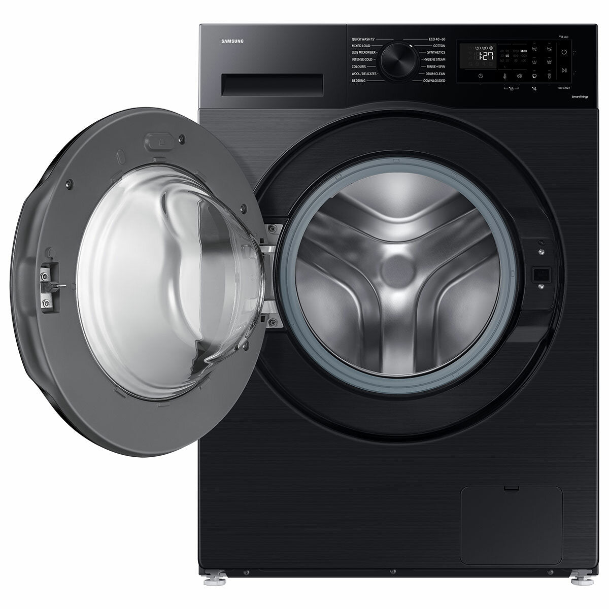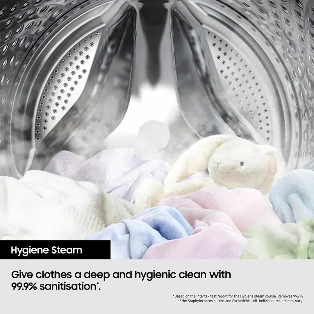 Ecobubble™ ecobubble™ technology is one of our brilliantly useful features designed to make laundry less of a chore. Mixing air, water and detergent it cleverly creates bubbles that wash your clothes at cooler temperatures, helping you to bring down your energy bills. SmartThings Energy Monitor and reduce your washing machine's energy use with SmartThings AI Energy mode*. For cycles using AI Energy mode you can reduce energy use by up to 70%** Less Microfiber Cycle Help to protect the environment by preventing clothes from shedding microplastics, which are discharged into the ocean. By optimizing the motor’s revolution speed and washing intensiveness, the Less Microfiber cycle reduces the amount of microfiber released into the environment by up to 54%*. Bubble Soak Meal time mess or grass stains? Whether it's cotton, synthetics or baby clothes, add a 30-minute bubble soak to your wash. Then let our unique ecobubble™ technology go deep into the fabrics to loosen stubborn stains. You'll love how brilliant it gets your whites. Hygiene Steam When it comes to deep down cleaning, not all washing machines are up to the job. So it’s good to know that Hygiene Steam on your Samsung washing machine banishes the things you can see and those you can’t – bacteria, pollen, dust mites and more. The steam is released upwards to make sure every last item gets a deep and even clean. The results? 99.9% of bacteria are obliterated and allergens inactivated*. No pre-soaking, no hassle, no worries. Drum Clean Looking for the cleanest clothes? It all starts with a sparkling washing machine. Drum Clean keeps the inside of your washer hygienically clean with a combination of soaking, pulsating and high-speed spinning that removes 99.9% of odour-causing bacteria* from the drum, without using any detergents. And it even reminds you after 40 washes to run a cleaning cycle. The best news? Good maintenance will save you some money in the long run. StayClean Drawer Keep your detergent flowing freely through your washing machine and get cleaner clothes with the StayClean Drawer. Targeted jets of water rinse away build-up in the drawer so you don’t have to. And because it keeps your washing machine in great shape, your clothes get thoroughly and hygienically cleaned every time. Digital Inverter Technology Happy laundry days. Here’s a quiet washing machine that’s built to last, has all the power you need, cuts down noise, and still uses less energy than a typical washing machine – so it’s kinder on your wallet too. It’s all thanks to our Digital Inverter Technology ramping up the performance, not the noise. And the added bonus? The components and engineering are backed by a 20 year warranty, giving you peace of mind for years to come. Wi-Fi Embedded Get a smarter washing experience with an intelligent, easy-to-use control panel that remembers your laundry habits and suggests your favourite cycles. While the SmartThings app* lets you schedule your wash from anywhere. Smart maintenance. Easy upkeep. Our Washing Machines and Tumble Dryers are packed with innovations that are made to last. But for added peace of mind, there's Smart Check on the Samsung SmartThings app*. If an error pops up, it helps you work out any issues using your phone. So you can take care of the troubleshooting yourself, without paying for an engineer. EAN: 8806095210636