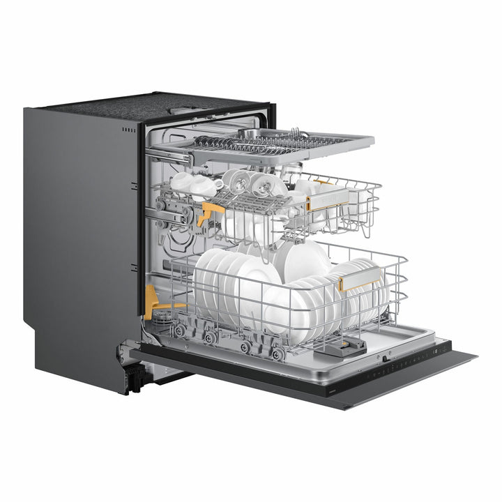 Energy Efficiency Save energy but clean and dry dishes effectively. Under the European energy labelling system, it has a high energy efficiency rating with A/B energy labels*. Using an innovative All-in-one Sump, it consumes less power and only 9.4 liters of water** without impacting on its washing performance. * A energy label: DW60DG790***, B energy label: DW60DG770***, DW60DG760***.** Based on internal testing, compared to the conventional Samsung DW60A6090BB model, which has an E energy label. WaterJet Clean™ Get outstanding washing results using the new WaterJet Clean™. With rotating dual wash arms it delivers intensive cleaning from every angle. Its two spray arms have separate water jets and rotate in opposite directions. So it cleans heavily soiled pots, pans and dishes rapidly and thoroughly. Extra Quiet Reduce noise in your home. The dishwasher works smoothly and quietly as it has an Inverter motor that reduces friction. It also has an Extra Silence program that washes a little bit slower, but creates 2dB less noise than the ECO program*. The amount of noise it makes is quieter than a library.* Based on testing conducted in an internal laboratory. The noise level of the DW60DG790***** / DW60DG770***** models: Extra Silence program = 41dB, ECO program = 43dB. The noise level of the DW60DG760***** models: Extra Silence program = 42dB, ECO program = 44dB. Auto Open Door Enjoy sparkling clean dishes every time with the Auto Open Door feature. When the rinse and dry process is complete, the door automatically opens 10cm to allow steam to escape. It gives you effective drying results compared to conventional methods*, especially for small items. * Based on internal testing of DW60DG790FSLU1 model, the difference of drying performance is around 50% when comparing with auto open door and without auto open door. Floor Info Light Check if your dishwasher is working with one quick glance! The Floor Info Light projects a blue beam onto the floor when a wash cycle is in progress. It is easy to see, even from a distance. And as soon as your dishes are clean and ready to be unloaded the light turns off. So no more guessing! Aqua Stop Stay safe from unexpected water damage with the Aqua Stop safety function. It shuts off the water supply and the electrical connection to stop the operation of the dishwasher if it detects small traces* of water. So it lessens you from electrical shocks and potentially expensive water damage. * Leakage sensor blocks the water supply when it detects around 60ml of water. Machine Care Keep the inside of the dishwasher hygienic, while being eco-friendly. Using Machine Care you can clean the cavity with one touch of a button. It removes dirt and odor-causing bacteria using only water, so you don’t need harsh detergent. And it automatically notifies you when it needs cleaning. Kitchen Fit™ Sliding Door* Make sure that your dishwasher fits seamlessly into your kitchen furniture. The Kitchen Fit™ Sliding Door features a sliding hinge that allows the door cover to slide upwards when the door is opened. So, unlike a fixed hinge, the door can be opened fully without having to cut the plinth below. * Custom panel weight range: 4.5-12kg (Self adjusting). ** Kitchen Fit Sliding Model: DW60DG7**I00**. EAN: 8806095680927