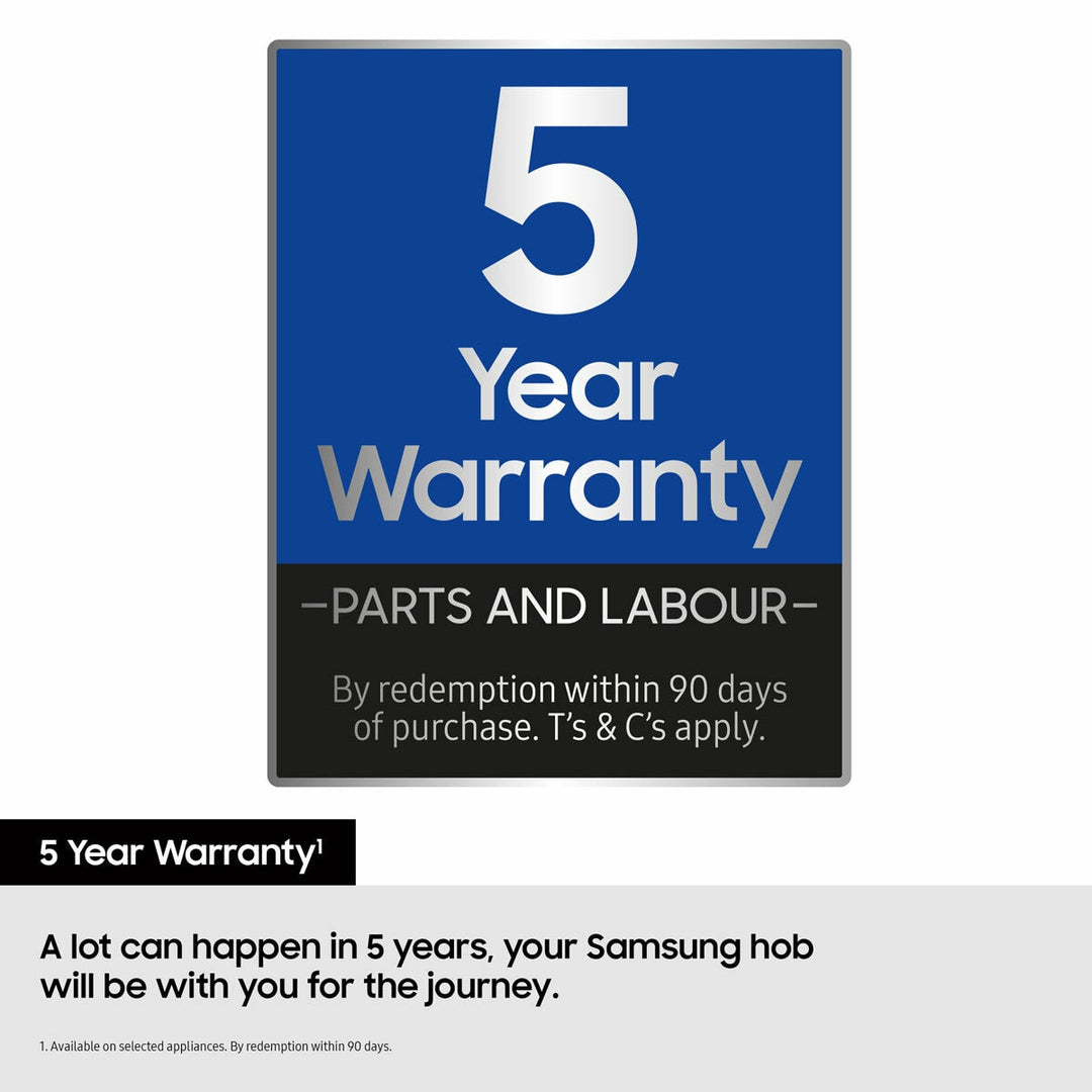 Additional 3 year warranty is redeemed and claimed from Samsung and not Costco. Products must be purchased within the promotional period between 1 March 2025 and 31 January 2026 The 5 Year Warranty must be registered within 90 days from the invoice date to validate any claim(s). To activate promotional 5 Year Warranty and for further terms and conditions, visit the Samsung registration site at  www.samsung.com/uk/fiveyearwarranty to register your products. If you have any problems using the online registration site please contact the Samsung Customer Support team (Tel: 0333 000 0333).   Flex Zone Plus Cook a greater variety of dishes at once. The Flex Zone Plus is a wide, open area with denser heating elements. It offers the flexibility to use different cookware, including large and long dishes, and detects the number, size and shape. So everything is cooked evenly, with less dead zones.