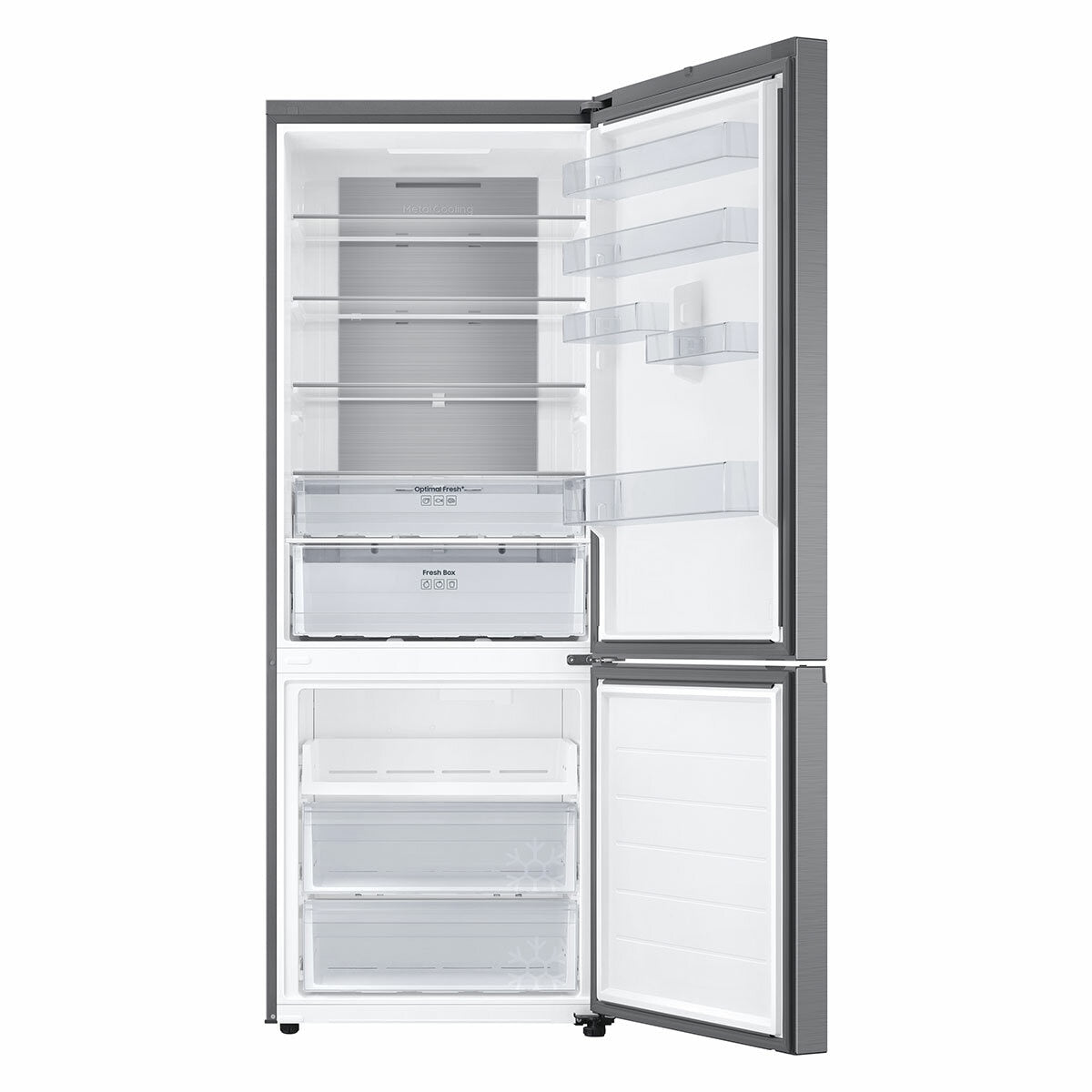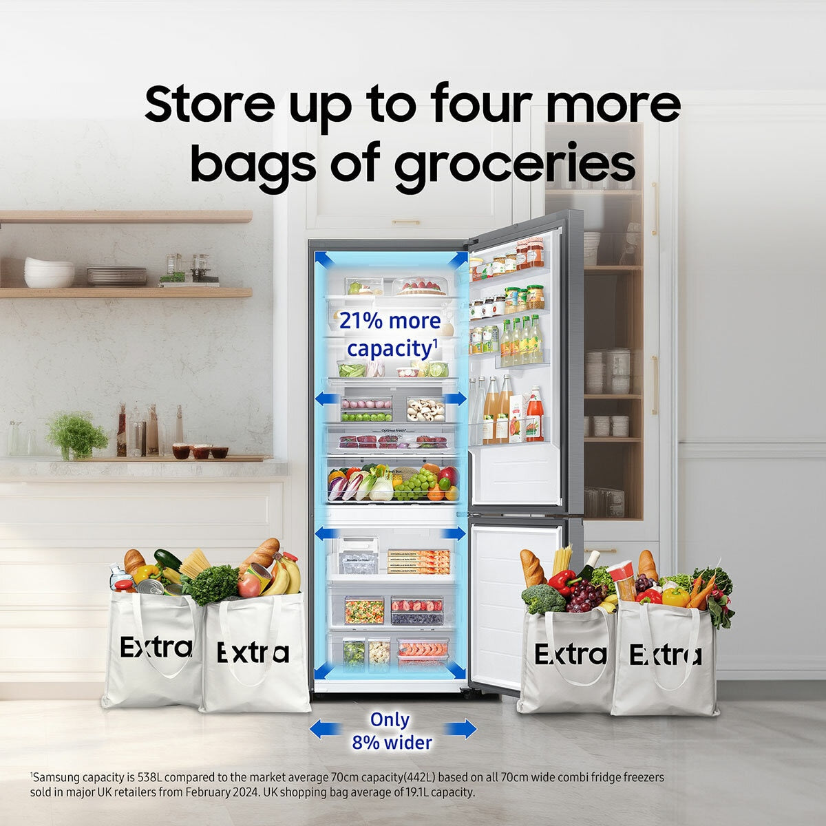 More inside, same outside Now you can get the best of both worlds with SpaceMax™. Thin walls mean more space for food storage on the inside, while the outside size stays the same. All without compromising on performance. You really can get the best of both worlds. Peace of mind Samsung refrigerators offer both outstanding innovation and durable long-lasting performance. They come with a 5 year parts and labour warranty for extra peace of mind. Plus Samsung provides the industry's longest 20-year warranty** on the Digital Inverter Compressor for exceptional reliability. Smart living made simple Monitor and proactively save energy. AI Energy Mode analyses your refrigerator usage patterns and estimates power consumption, based on AI technology. If the estimated electric bill exceeds your preset target, it recommends you to activate the saving mode to reduce energy use. Smart household energy efficiency Manage your energy usage to reduce your carbon footprint and save money. SmartThings Energy* provides energy efficiency tips. It also monitors the energy consumption of appliances in real-time and compares it to the previous month. And it alerts you if your monthly targets might be exceeded. Automated care and problem diagnosis Take care of your refrigerator more easily. SmartThings Home Care provides real-time monitoring and alerts. You can check on its status, including the condition of the water filter. It also automatically notifies you if parts need replacing or problems are detected, and suggests a solution. Smart Cooking. Tasty food Manage, prepare and buy food more effectively. SmartThings Food lets you create a list of the food in your refrigerator and manage expiry dates, so you can check what you have anytime, anywhere. It also recommends personalized recipes based on your preferences and ingredients. Put defrosting on ice Wouldn't finding the ice cream be that bit easier with a frost free fridge freezer? The Total No Frost feature maintains an even temperature, preventing ice build-up, saving you the time and hassle of defrosting. Even cooler inside Keep food cool with the metal cooling plate, retaining the cold temperature and restoring any heat loss quickly. With a beautiful reflective metal interior, the fridge looks as good on the inside as it does on the outside. Control the freshness The Optimal Fresh + box features two temperature zones, so you can maximise the freshness of different foods at the same time. Store your meats and fish in the left side where it’s cooler, and keep your fruit and veg at its best on the right. Or, you can set it for a single temperature to maximise space. It’s that easy for you to keep food fresh. The power is yours Power Cool quickly replenishes any cool air loss when stocking your fridge with fresh food. And Power Freeze rapidly flashes your freezer to a lower temperature, once you've stocked up to keep frozen favourites at their best. Ensuring the weekly shop is kept fresh. Play it cool Never lose your cool with All-Around Cooling. It does what it says on the tin – moving cool air around the fridge to keep food fresh, with a constant temperature. So everything from chicken to cucumbers will be evenly chilled. Every item stays ideally cooled no matter where it’s stored in the fridge. EAN: 8806095536606