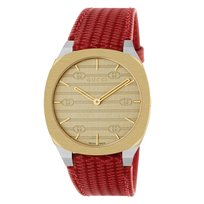 The GUCCI 25H's streamlined silhouette was inspired by the sleek forms of contemporary architecture. This watch is designed with a thin multi-layer case and red leather strap, while the design is completed by a golden brass dial and an Interlocking G motif.34 mm stainless steel and 18k yellow gold plated multi layered case, golden brass dial with Interlocking G, red leather strapSapphire glass with antireflective coatingThe warranty certificates for Gucci watches purchased after March 1st 2022 are exclusively available online.Download your certificate athttps://watchwarranty.gucci.comby using the serial number engraved on the back of your watch.3 ATM (30 metres/98 feet)Quartz movementWrist size: 140 to 185 mmYA163415Swiss Made