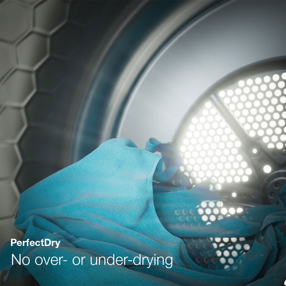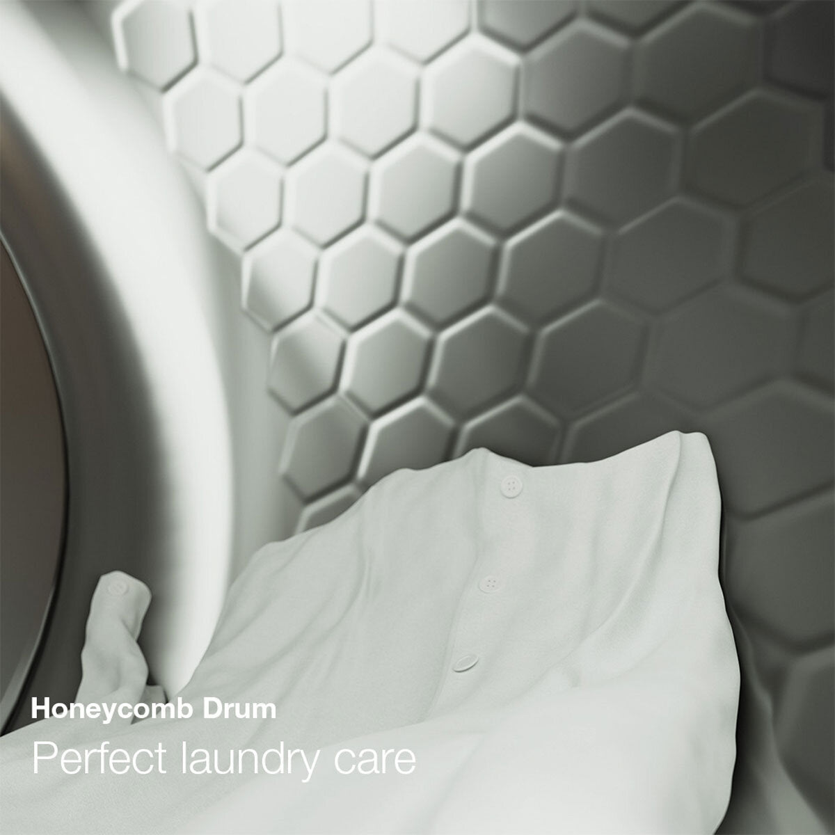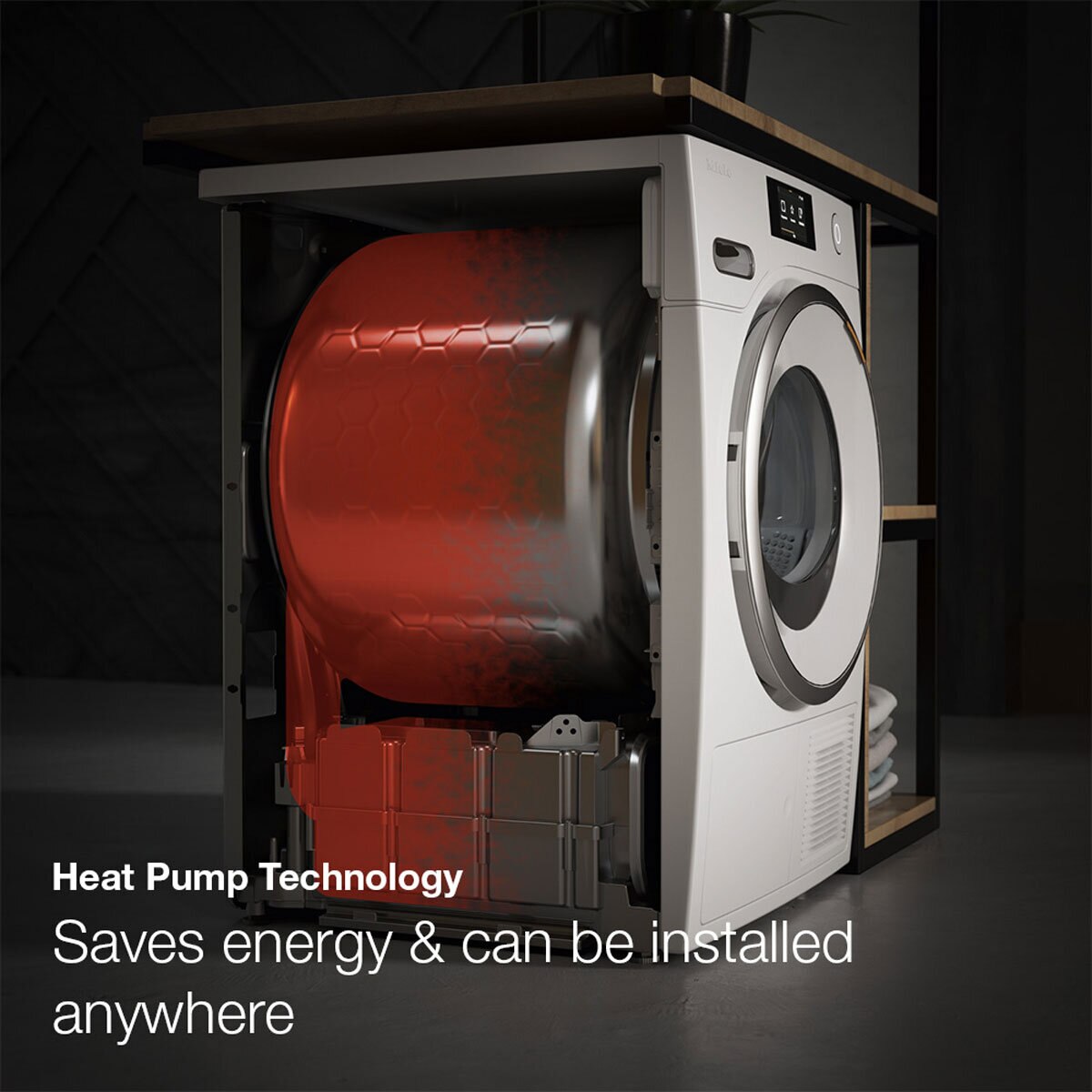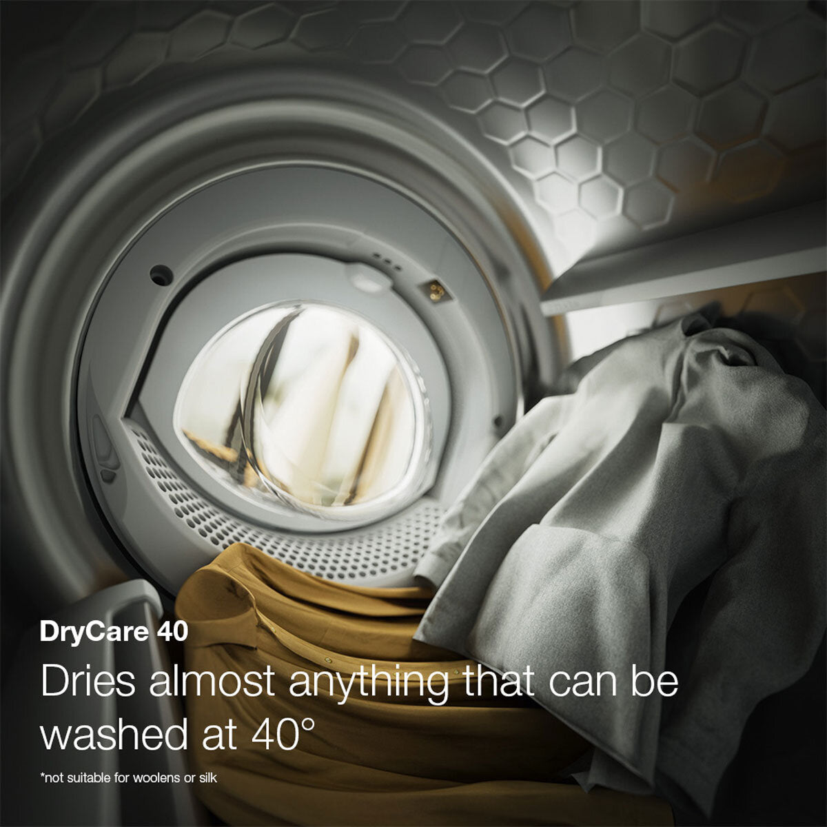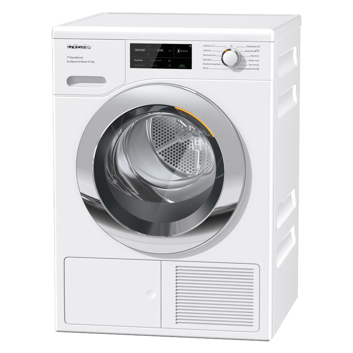 EcoSpeed Due to our heat pump system, our EcoSpeed technology saves you time, money and is better for the environment. Dry a full load of washing 20 minutes faster than before, whilst also being highly energy efficient. (A+++ energy rating).  Heat Pump Technology Heat Pump technology allows you to install the tumble dryer anywhere in your home and save up to 50% in running costs vs. a condensor dryer, helping both you and the environment.  Our heat pumps combine EcoDry technology which guarantees long-term low emergy consumption and short drying times with PerfectDry which adjusts the drying process leaving clothes perfectly dry. Drying programmes for all your needs. A range of programmes for all your essential drying needs, including Express dry, and specialist programmes. Now also with DryCare which dries clothing washable at 40°C, HygieneDry which ensures that 99.99% of all bacteria are reliably removed and Dry Fresh for delicate clothing. PowerFresh The new PowerFresh reduces odours even better by using steam – even without washing. PowerFresh starts with an intensive moisturising phase. Steam makes for better heat transfer to the load, thereby releasing and removing odour molecules more efficiently. Honey Comb Drum The huge genuine 9kg capacity is ideal for large families, with the patented Honeycomb Drum designed to offer the gentlest laundry care So extremely quiet, you won’t even know its on. At only 64dB sound rating you will hardly notice the tumble dryer is working, meaning no disturbance in your home or for your family. Energy efficiency Miele tumble dryers are designed to minimise energy consumption. As a result, many of our models are awarded the highest energy efficiency class – with some models even surpassing that performance – for a drying experience that delivers excellent results, and respects both your wallet and the environment EcoDry technology Our tumble dryers with EcoDry technology dry a full load of laundry quickly with minimum energy consumption. What’s more, our patented filter system (patent EP 2 455 537) prevents fluff from blocking up the heat exchanger. It is through this synergy that Miele tumble dryers are able to maintain their performance throughout their service life and deliver impressively short running times. DryCare 40 extra Load your clothes into the tumble dryer straight away after a 40 °C wash programme without having to sort through them first. Low air temperatures protect your sensitive fabrics when adding the DryCare 40 extra to various drying programmes. This makes it a quick and convenient way to save time when both washing and drying 40 °C fabrics, ensuring they’re handled with the same care. SteamCare steam system Experience visibly smoother fabrics with Miele. At the beginning of the drying process, water is gently sprayed into the honeycomb drum and heated by the drying air, with the developing steam visibly smoothing the laundry. Additionally, PowerFresh uses steam to freshen up your fabrics without having to wash them first. Optimum results can be achieved by adding a DryFresh®fragrance flacon to neutralise odours. EAN: 4002516476269 NOTE: The ambient temperature for installation is 5~35℃. Make sure that the temperature where the dryer is installed is not outside the recommended temperature range otherwise drying performance may be reduced. If the ambient temperature is low enough to freeze the condensed water in the dryer and hoses, the dryer may not operate, or can be damaged. Make sure not to install the dryer in an enclosed environment or near any heat producing appliances.